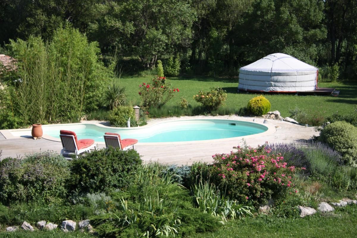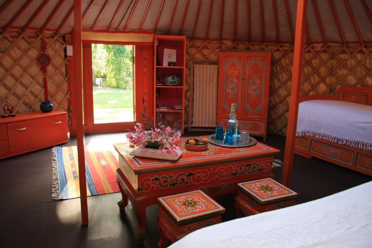 Nous vous recevons dans un bel espace verdoyant et ombragé, à proximité du village (10 mn à pied) véritable yourte mongole de 32 m² équipée pour 4 personnes (1x2 pers + 2x1 pers), table basse et 4 tabourets. Bloc sanitaires (douche/wc) et cuisine privatif dans la prairie, 2 salons de jardin. Petit déjeuner copieux servis avec des produits faits maison ou issus de productions locales (possibilité de le déduire du tarif, pas de petits déjeuners en pleine saison). Piscine paysagère sécurisée (4 x 8 m) commune avec les propriétaires. Espace extérieur privatif de 1000 m². Accès internet. Parking. Accueil motards.Prestation massages sur demande (ayurvédique, chinois, thaï par une masseuse diplômée). Location > 4 nuits : tarif forfaitaire à partir de 300€. Tarif dégressif à la nuit à partir de 2 nuits.