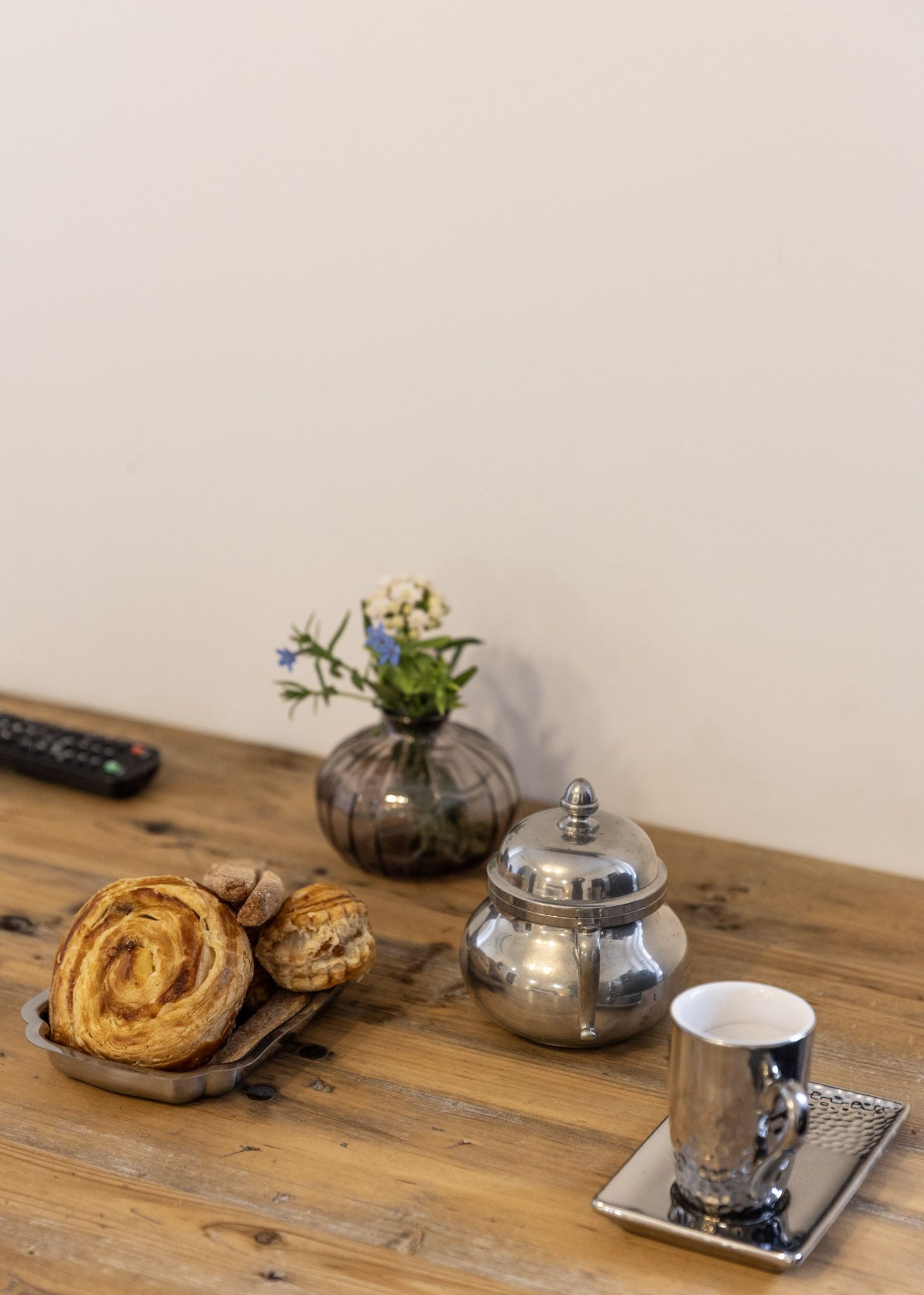 Un espace extérieur, fleuri et ombragé, est disponible pour profiter d'un petit déjeuner en plein air.