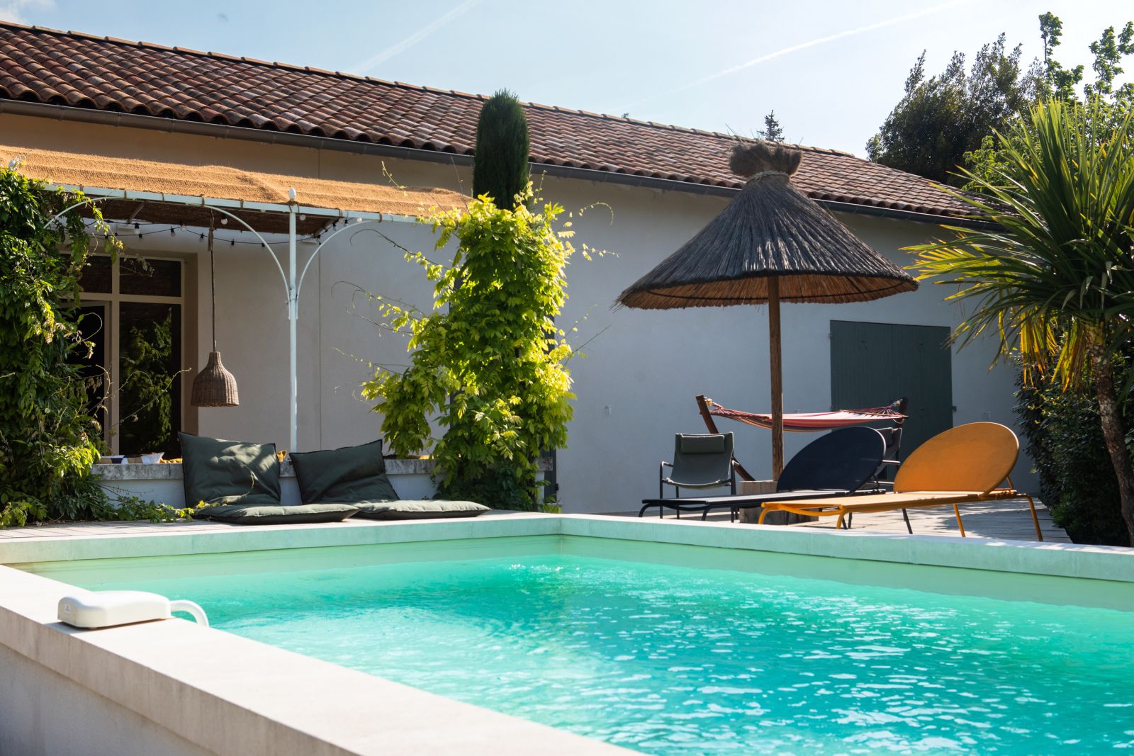 Maison de plain pied, lumineuse, de style bohème située à 800m du centre ville d'Eyragues. Tout y est conçu pour un moment de farniente et de convivialité.