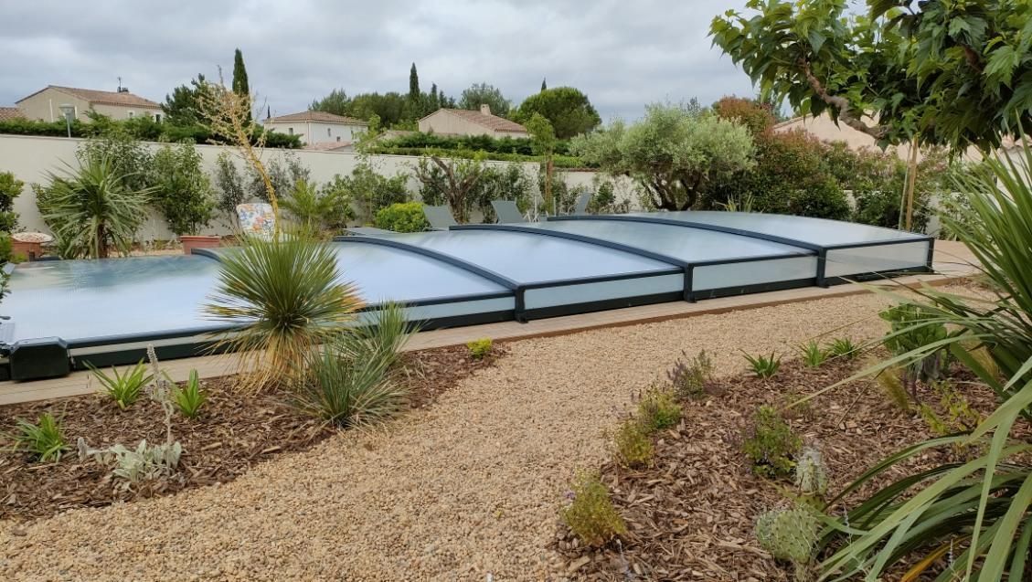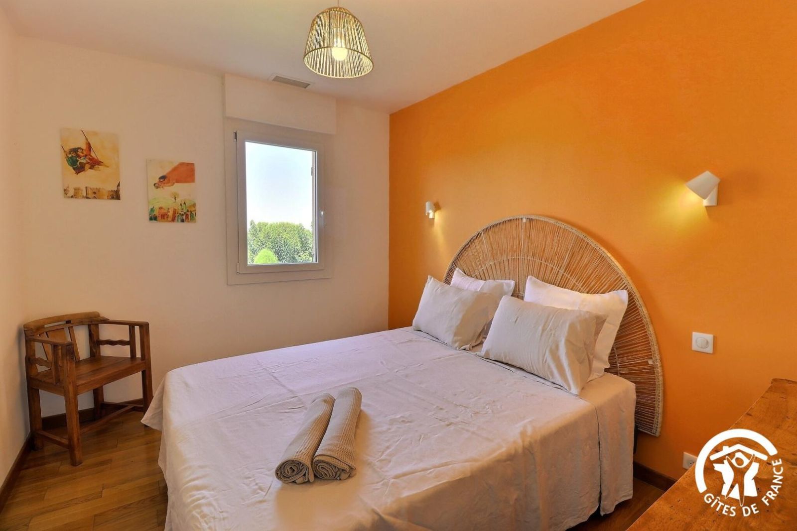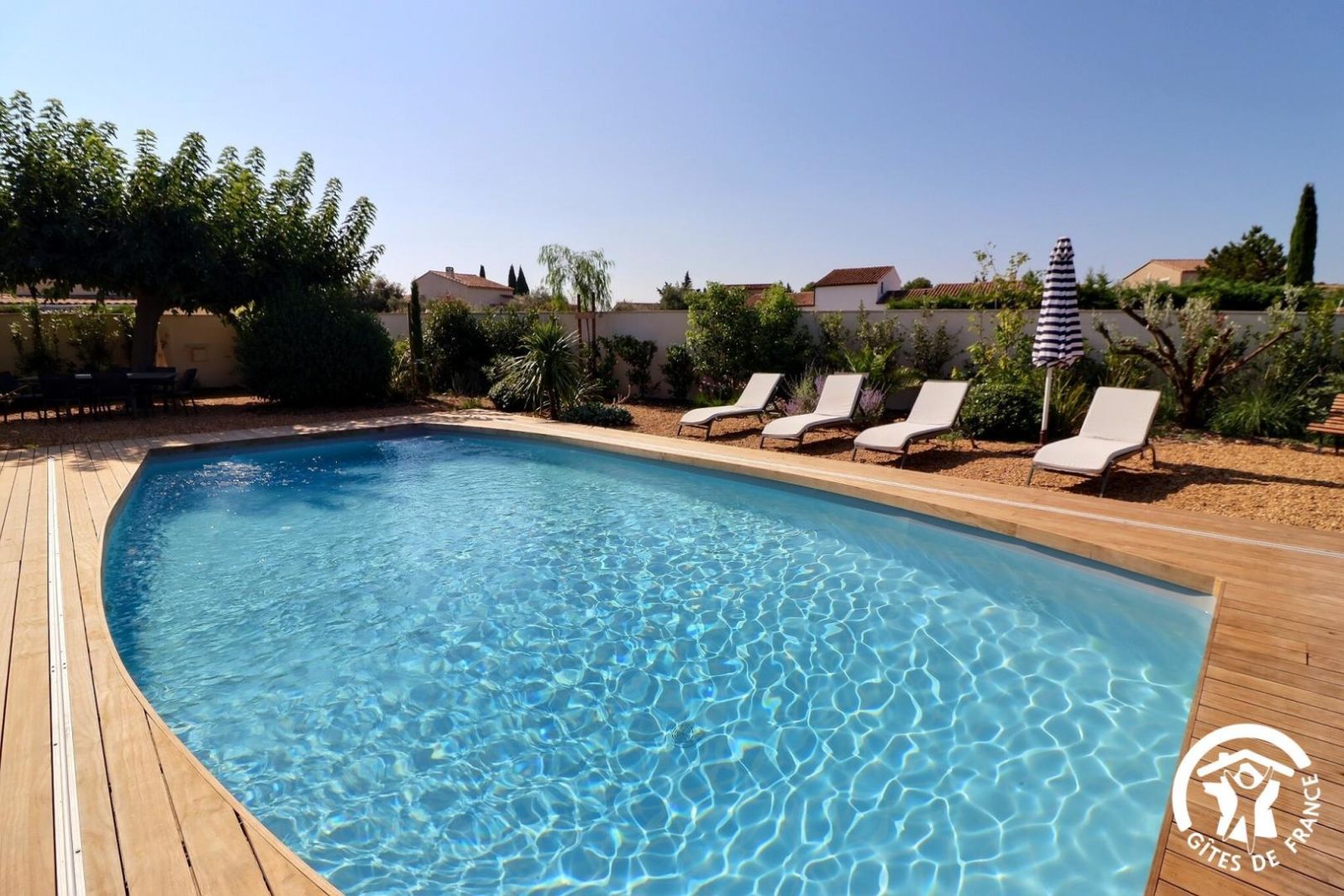 Il dispose d'un jardin de 1000m² avec deux terrasses, une au sud et une à l'ouest et d'une piscine 10x4.5 avec abris télescopique permettant de chauffer la piscine (ouverte de mai à septembre selon la météo). Le gîte est composé au rez-de-chaussé de : - une cuisiné équipée avec four, plaque induction, hotte aspirante et frigo américain ouverte sur le salon avec canapé, fauteuils, TV, piano et fauteuils.