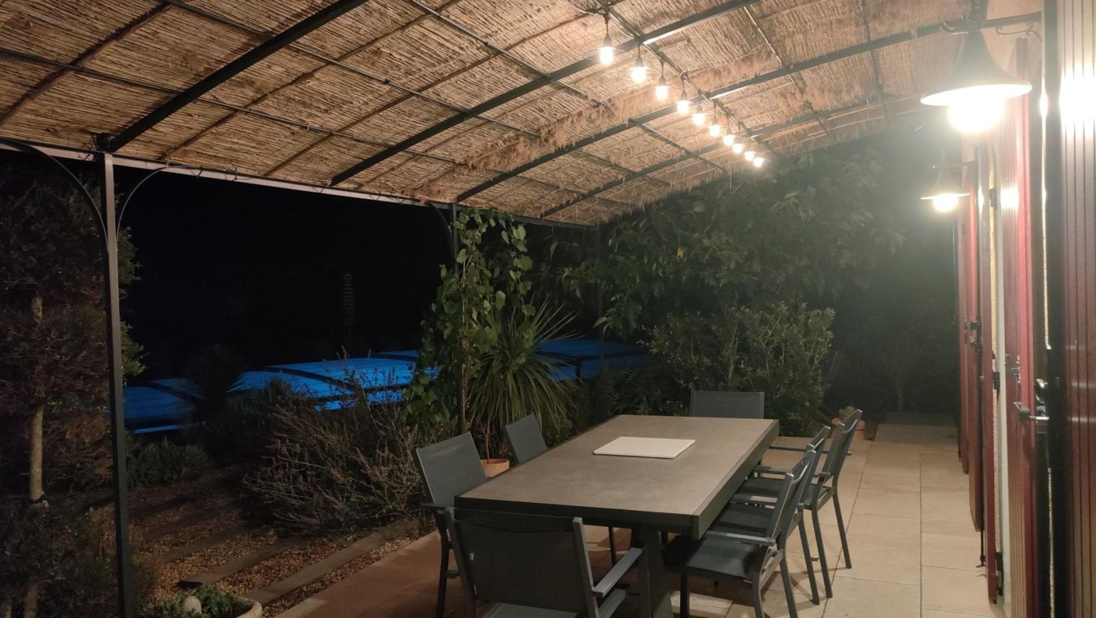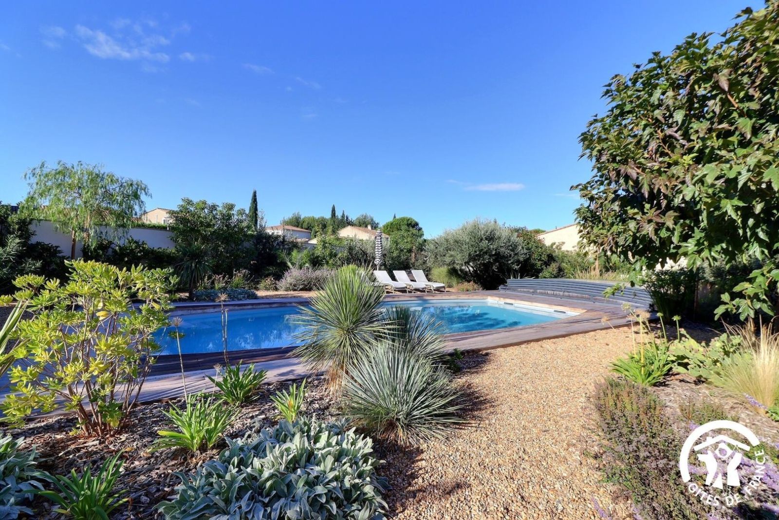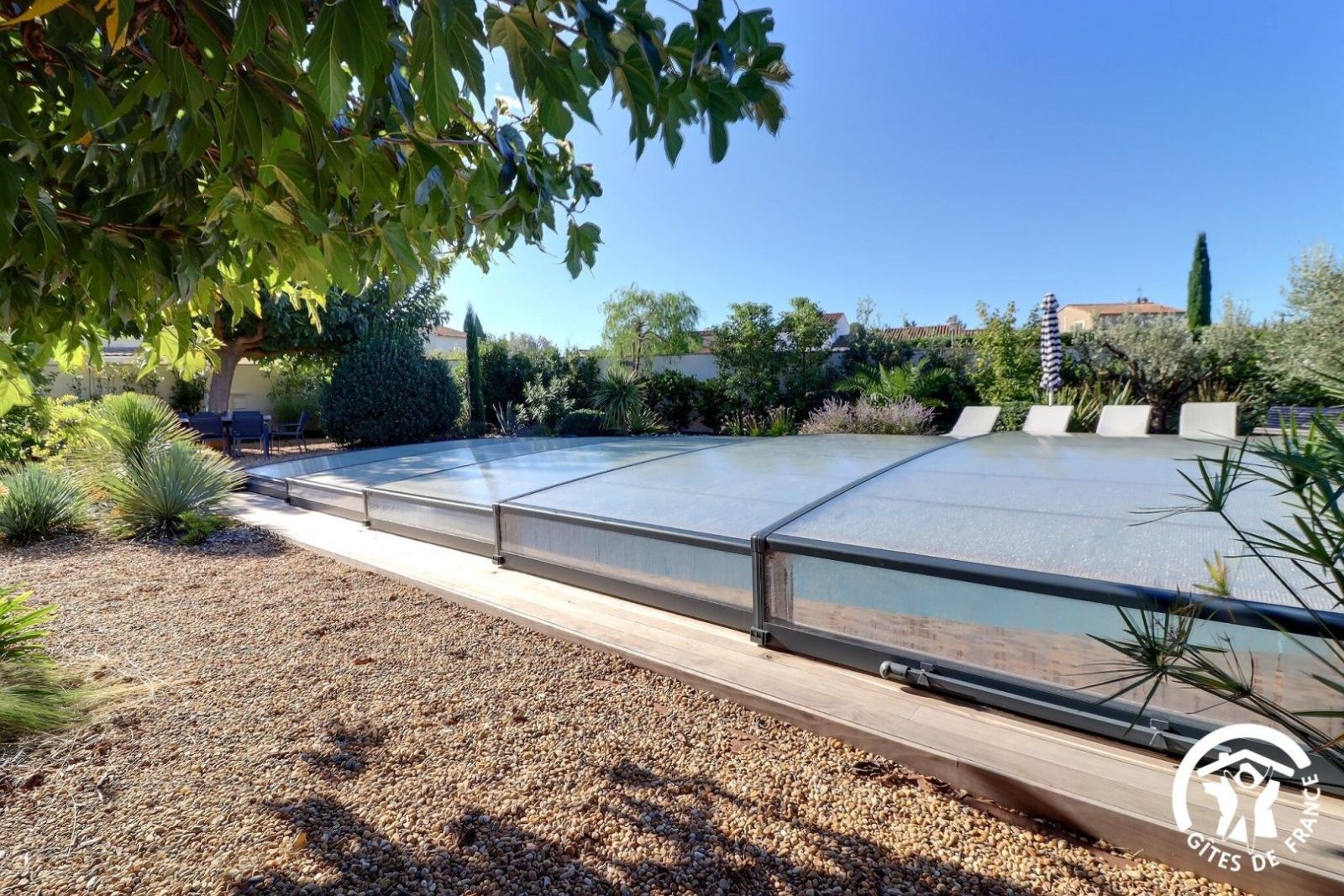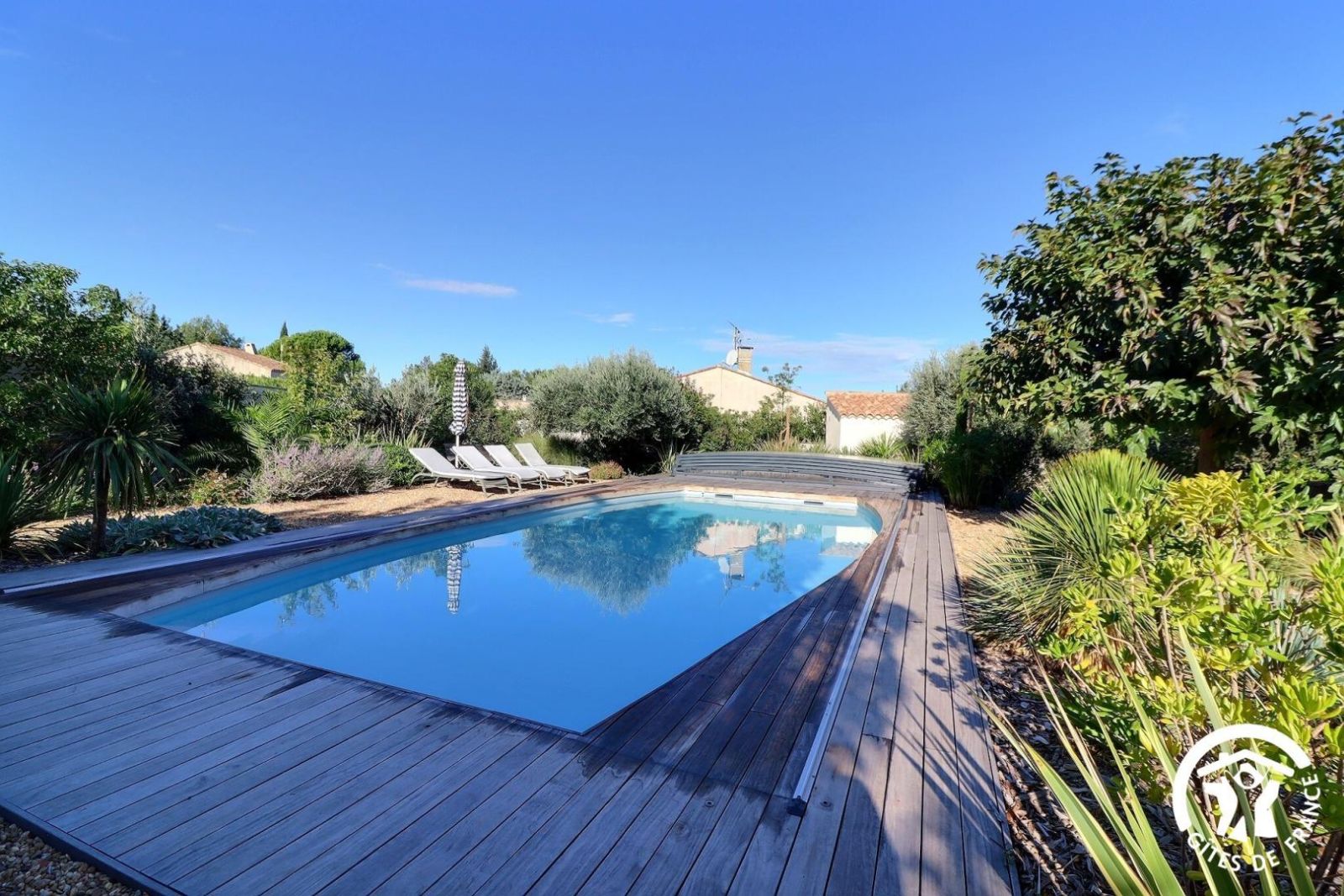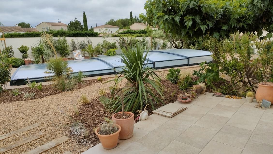 Il dispose d'un jardin paysagé de 1000m² avec deux terrasses, une au sud et une à l'ouest et d'une piscine 10x4.5 avec abri télescopique permettant de maintenir la chaleur de la piscine (ouverte de avril à fin septembre selon la météo - l'abri doit être fermé en cas de vent ce qui n'empêche pas de se baigner dessous).