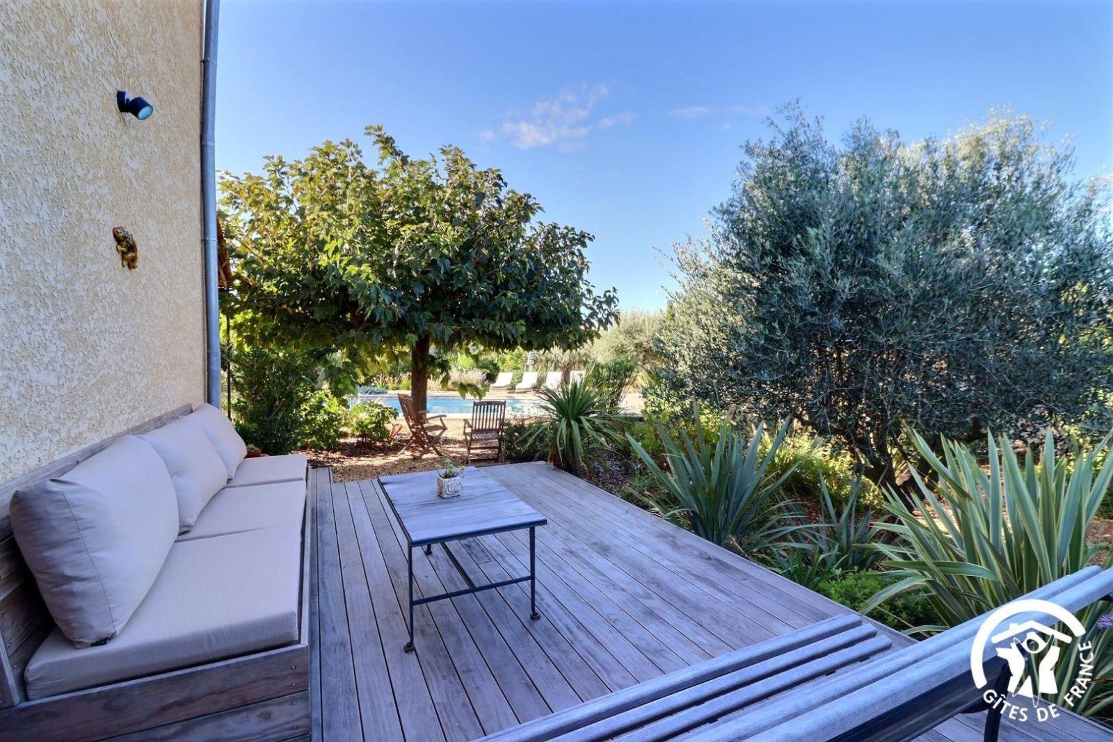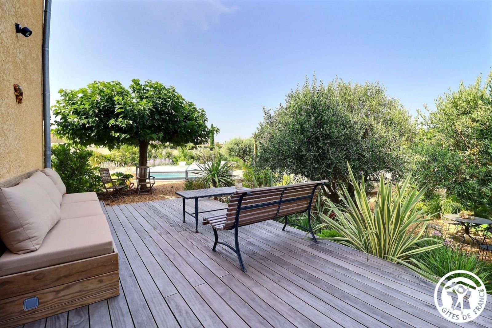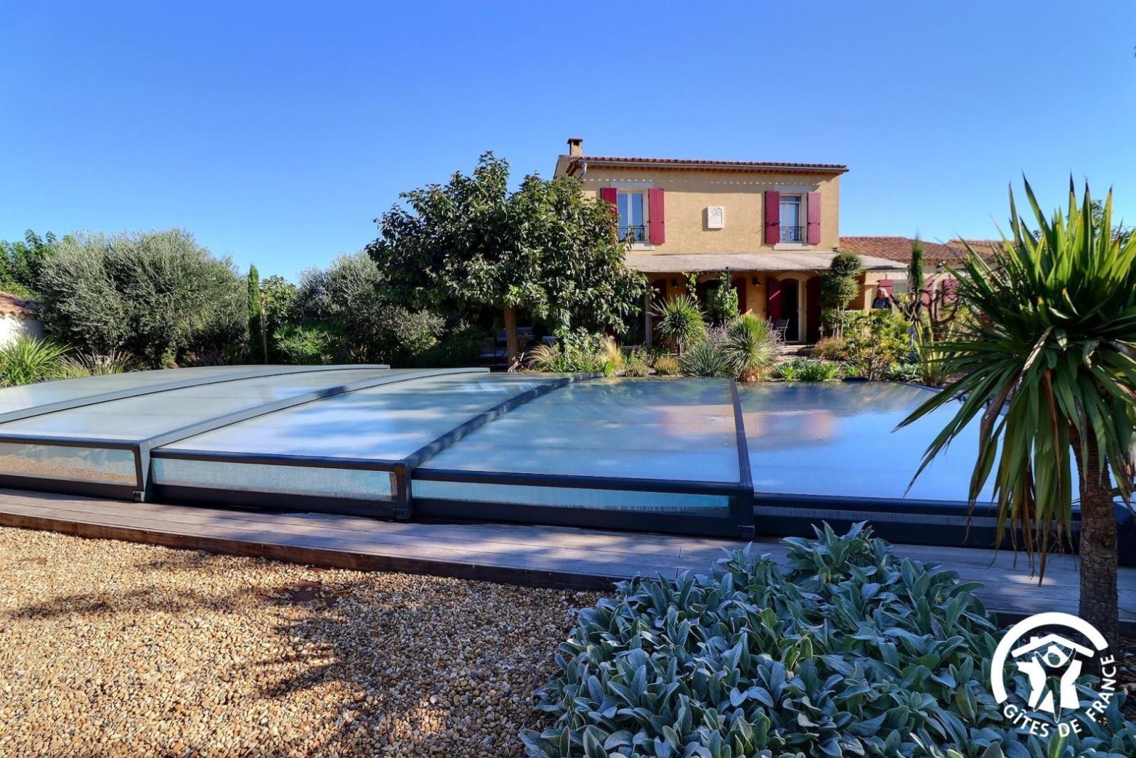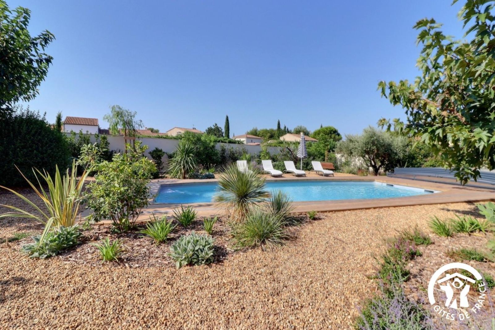 Il dispose d'un jardin paysagé de 1000m² avec deux terrasses, une au sud et une à l'ouest et d'une piscine 10x4.5 avec abri télescopique permettant de maintenir la chaleur de la piscine (ouverte de avril à fin septembre selon la météo - l'abri doit être fermé en cas de vent ce qui n'empêche pas de se baigner dessous).