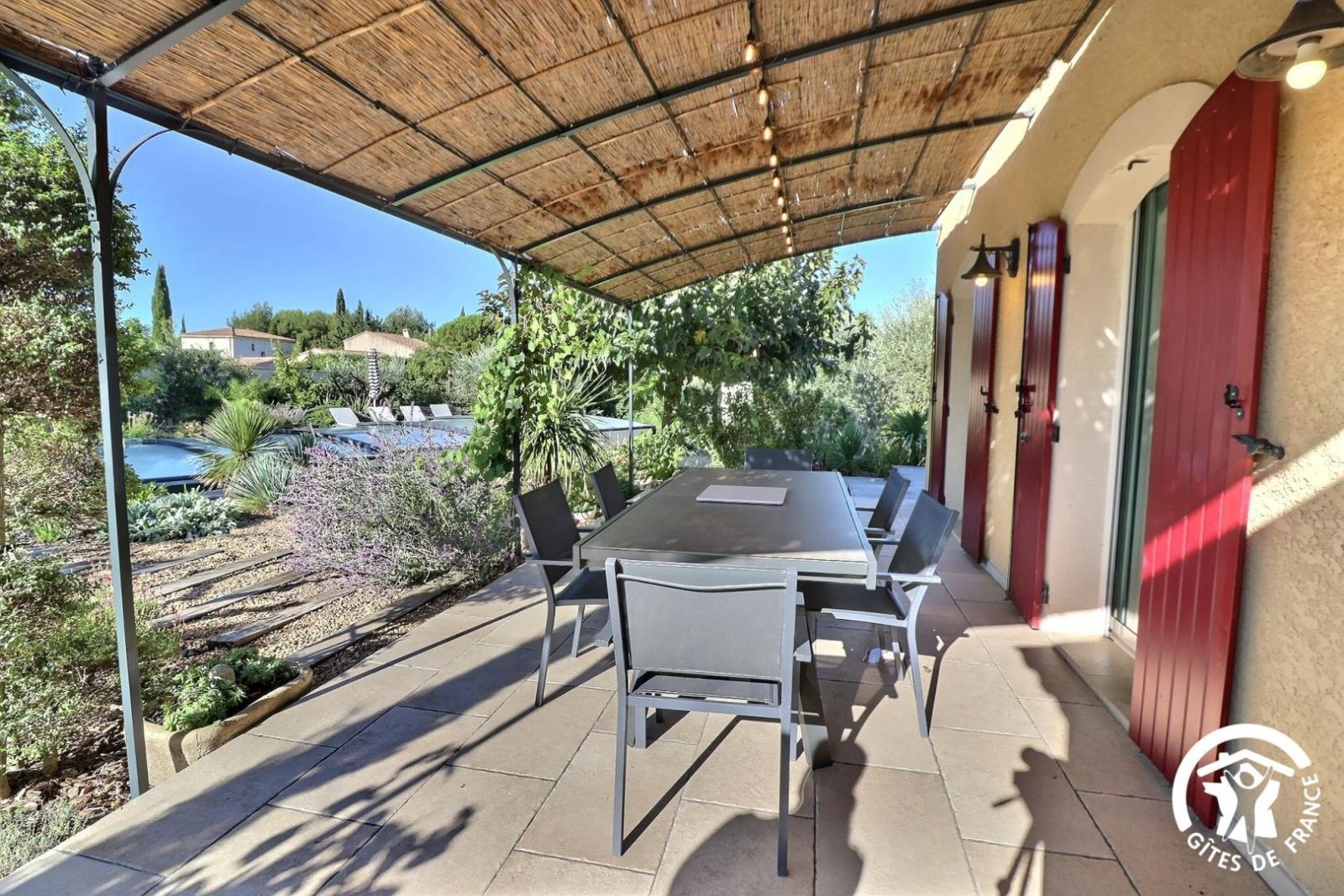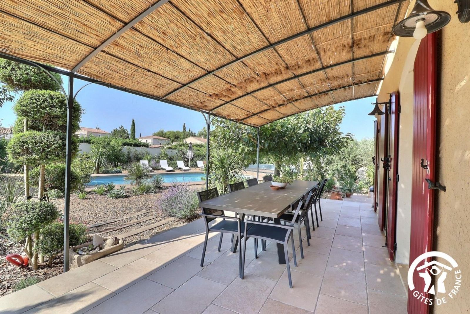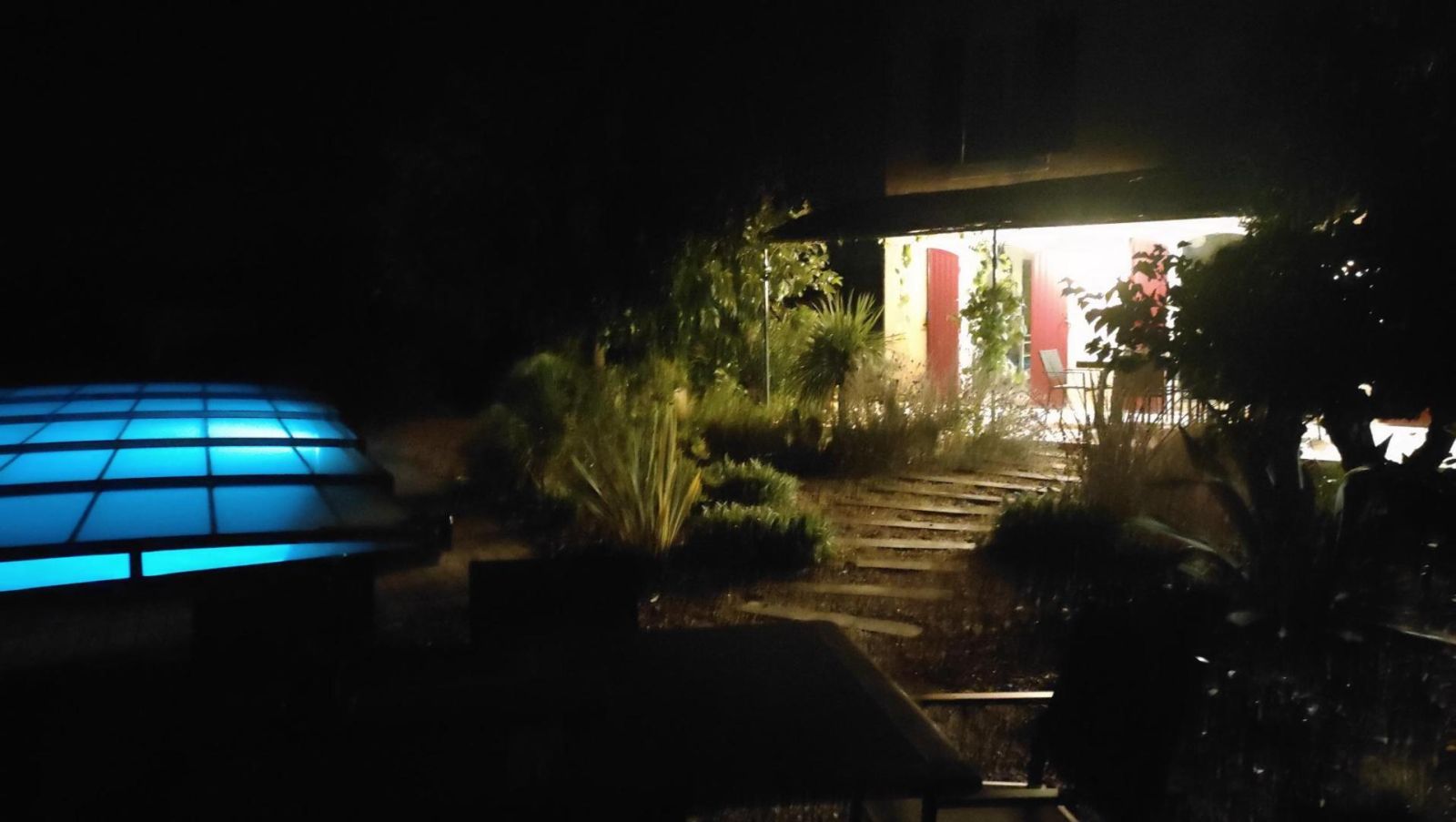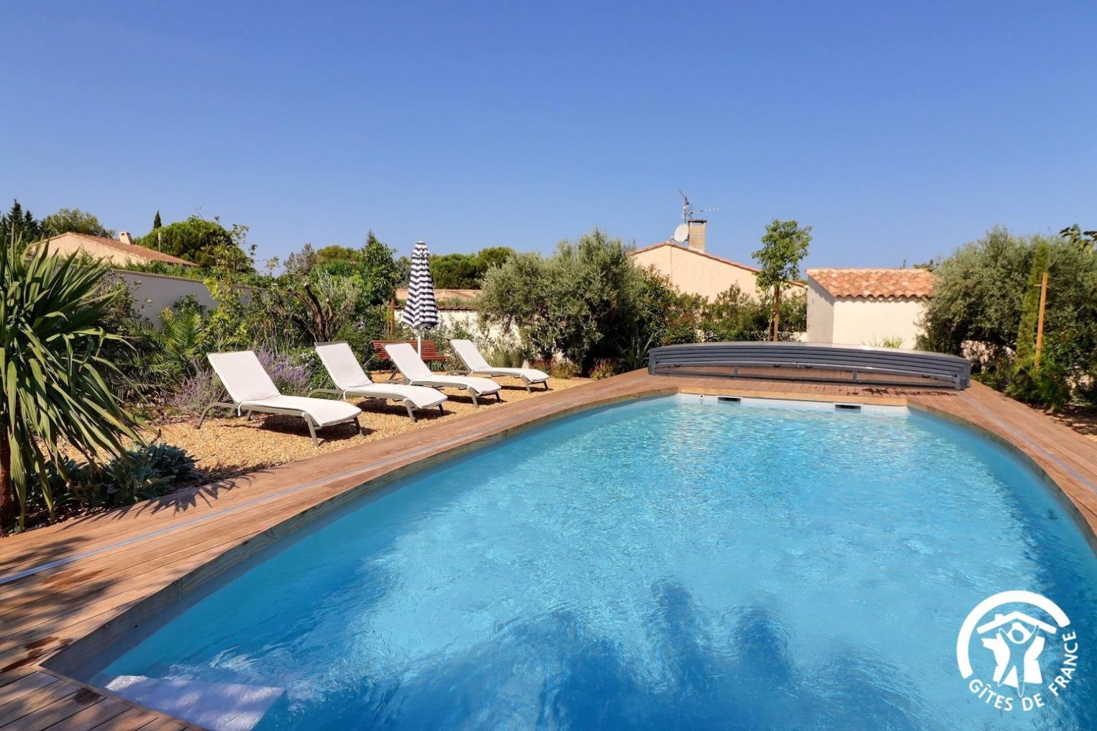 Il dispose d'un jardin paysagé de 1000m² avec deux terrasses, une au sud et une à l'ouest et d'une piscine 10x4.5 avec abri télescopique permettant de maintenir la chaleur de la piscine (ouverte de avril à fin septembre selon la météo - l'abri doit être fermé en cas de vent ce qui n'empêche pas de se baigner dessous).
