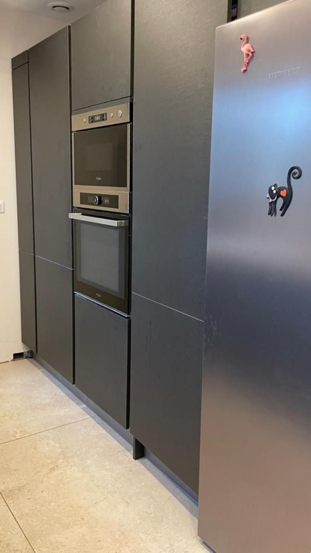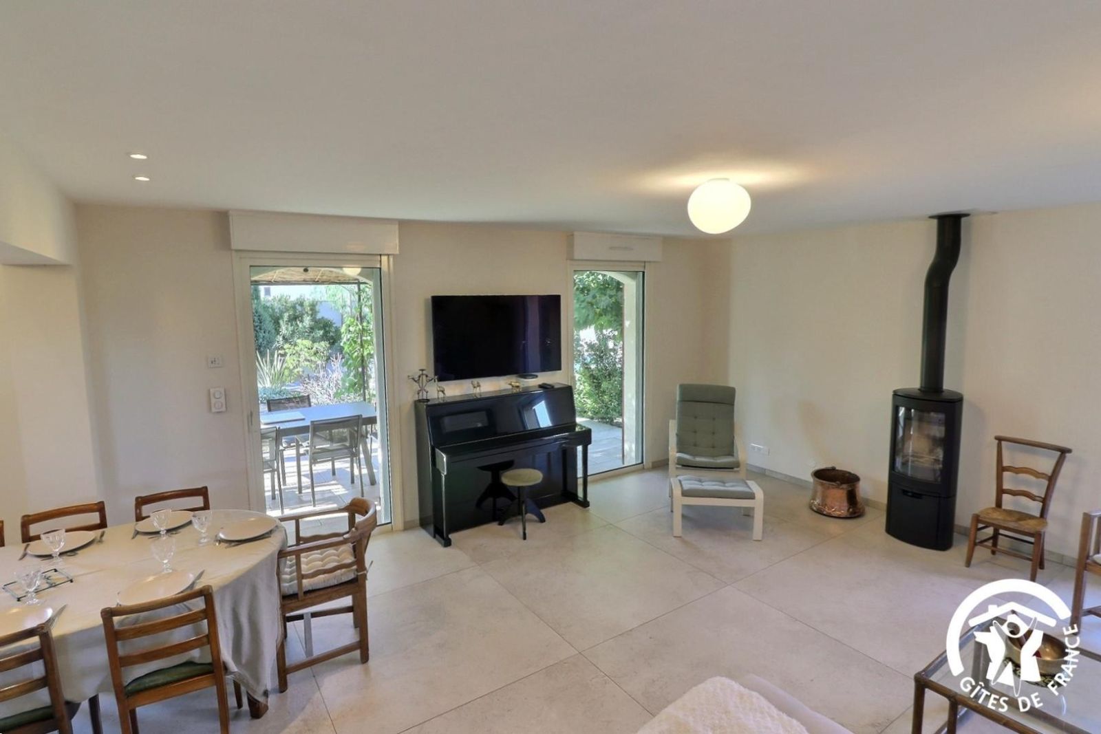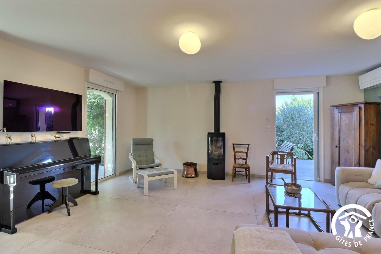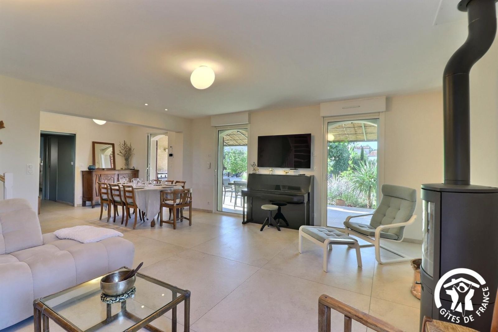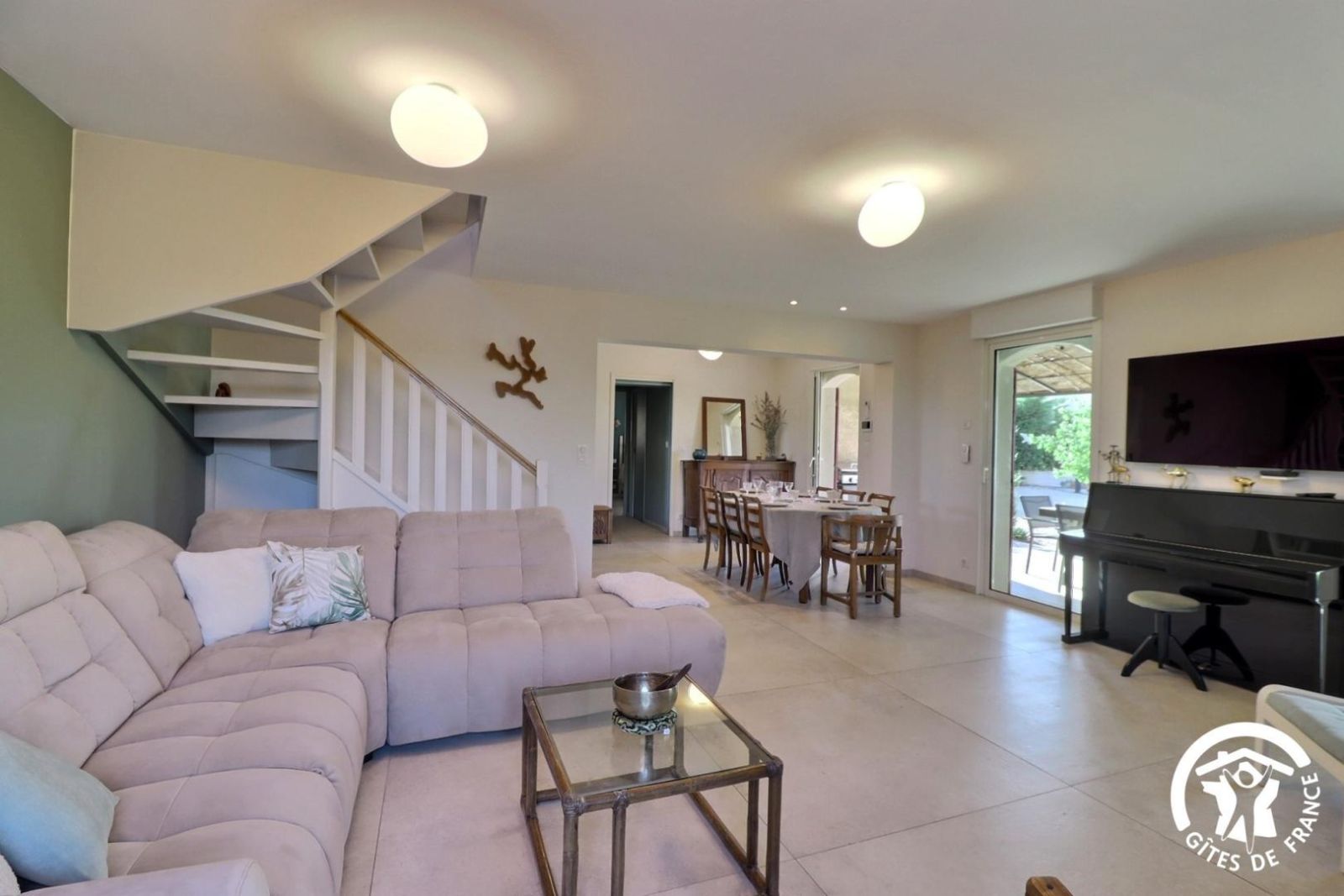 - une cuisiné équipée avec four, plaque induction, hotte aspirante et réfrigérateur-congélateur ouverte sur le salon avec canapé, fauteuils, TV, piano et fauteuils.