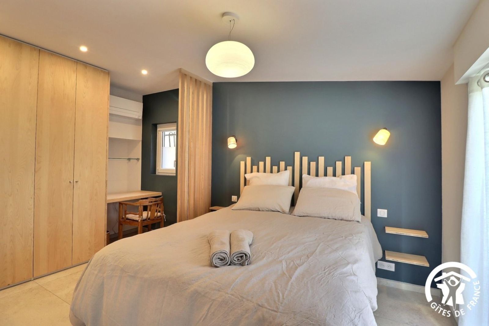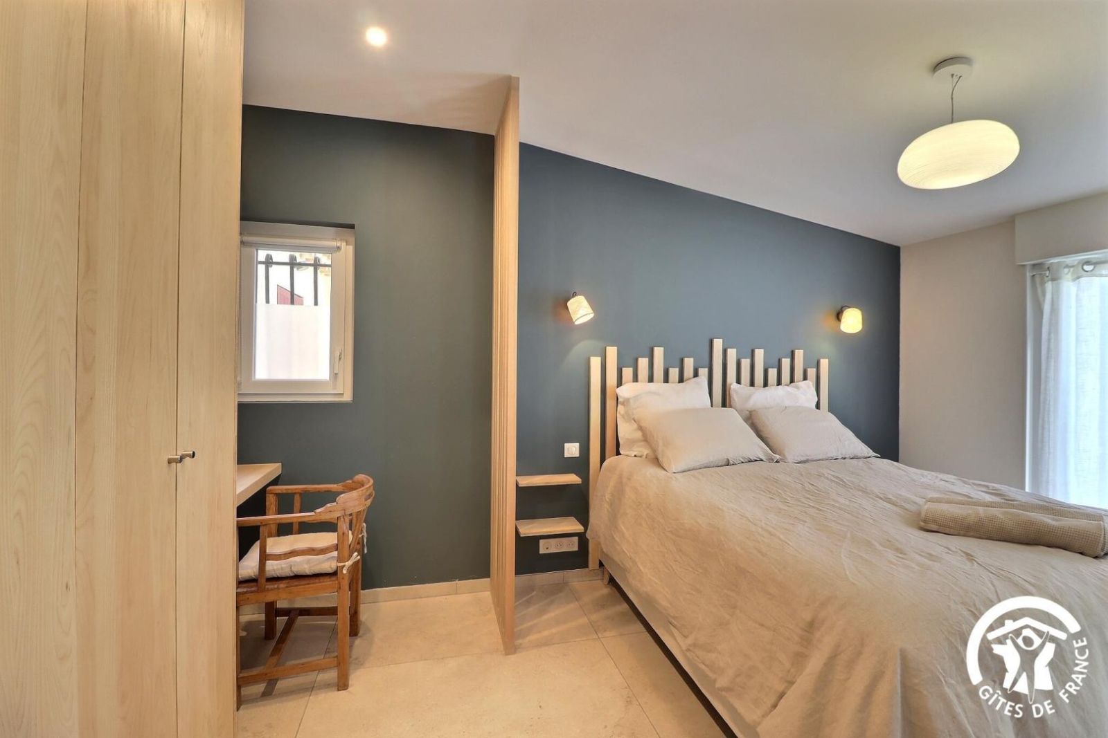 - une chambre avec un lit 160x200 (séparable en 2 lits 80x200), bureau et placard