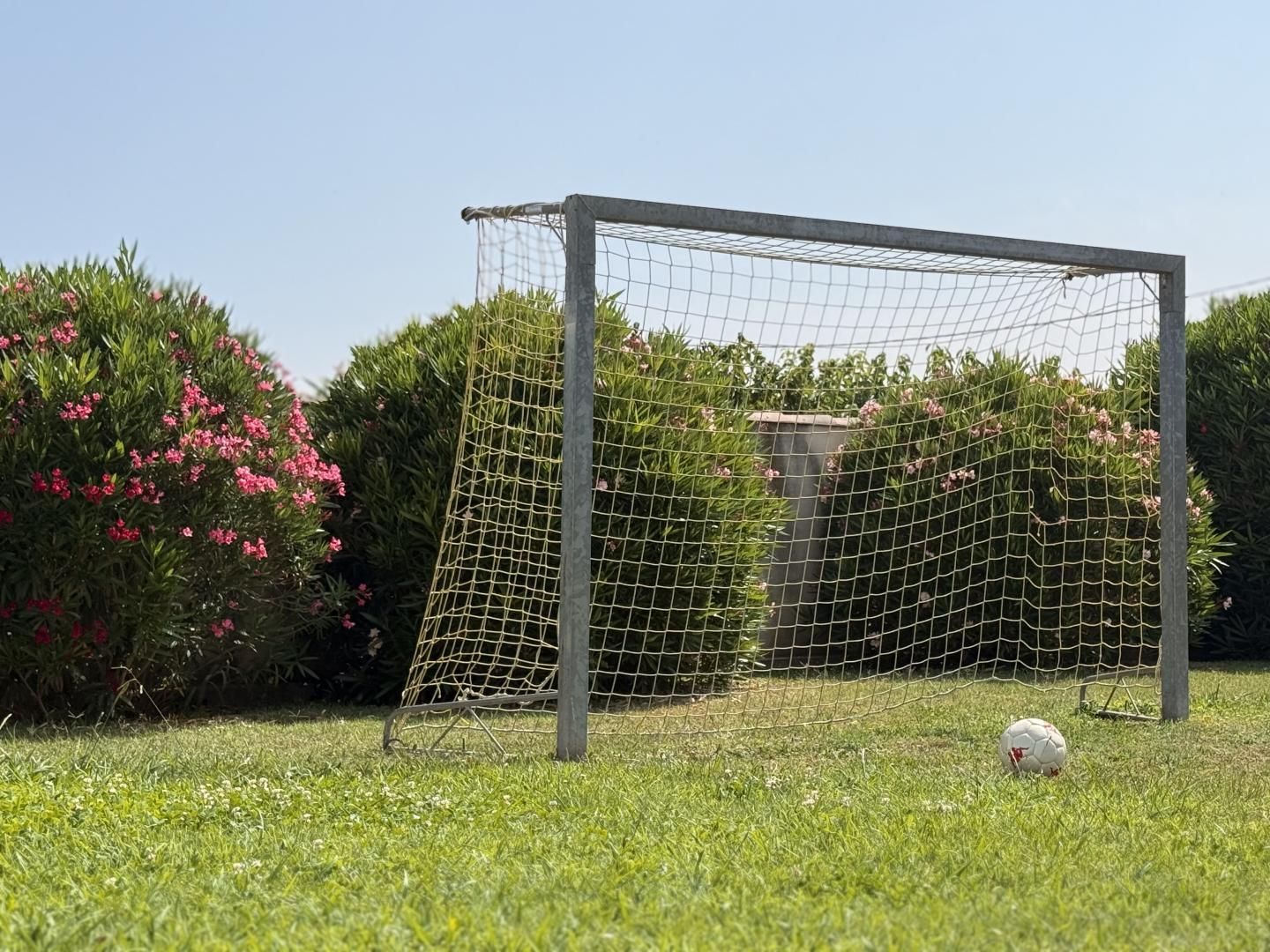Portique avec balançoire, Trampoline, panier de basket, terrain de boules et de football.
