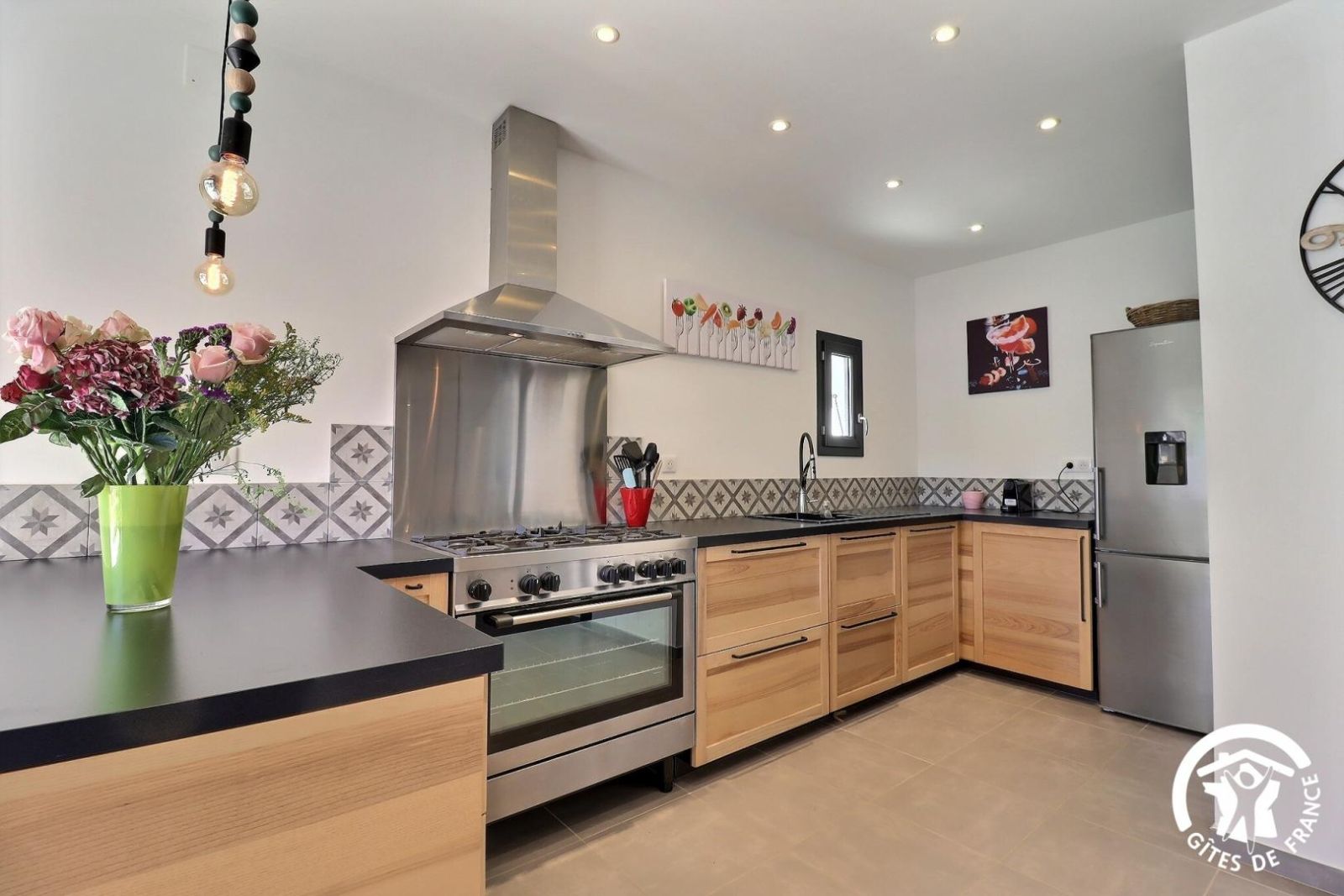 - Une cuisine avec piano 5 feux gaz, four grande capacité, hotte, évier avec douchette, lave-vaisselle, micro-ondes,