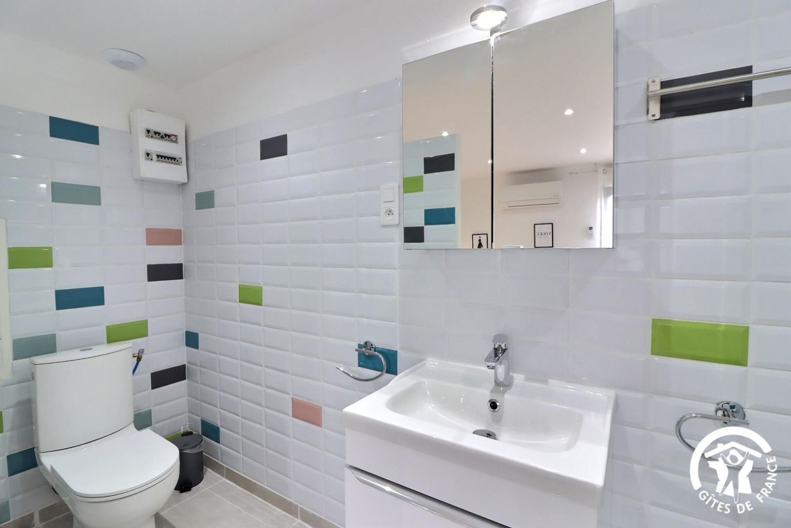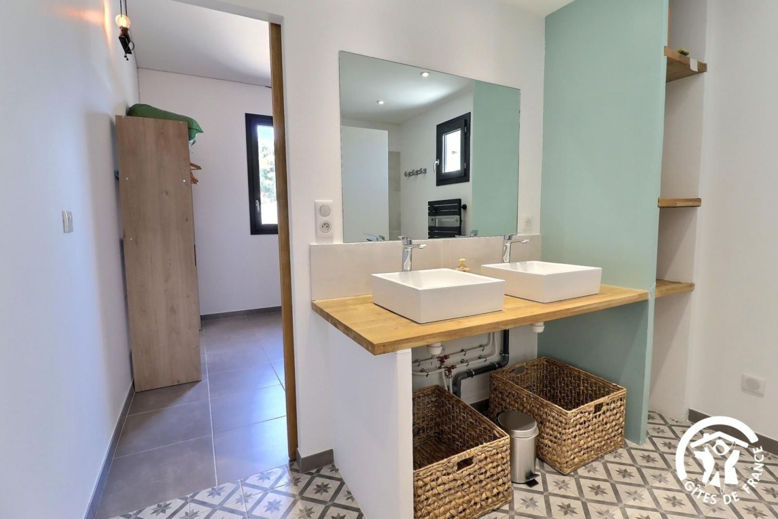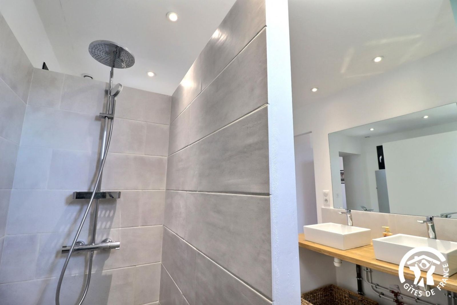 - Salle d'eau avec douche à l'italienne 90x120cm, double vasque, porte-serviettes chauffant, étagères, miroir en pied et bac à linge.