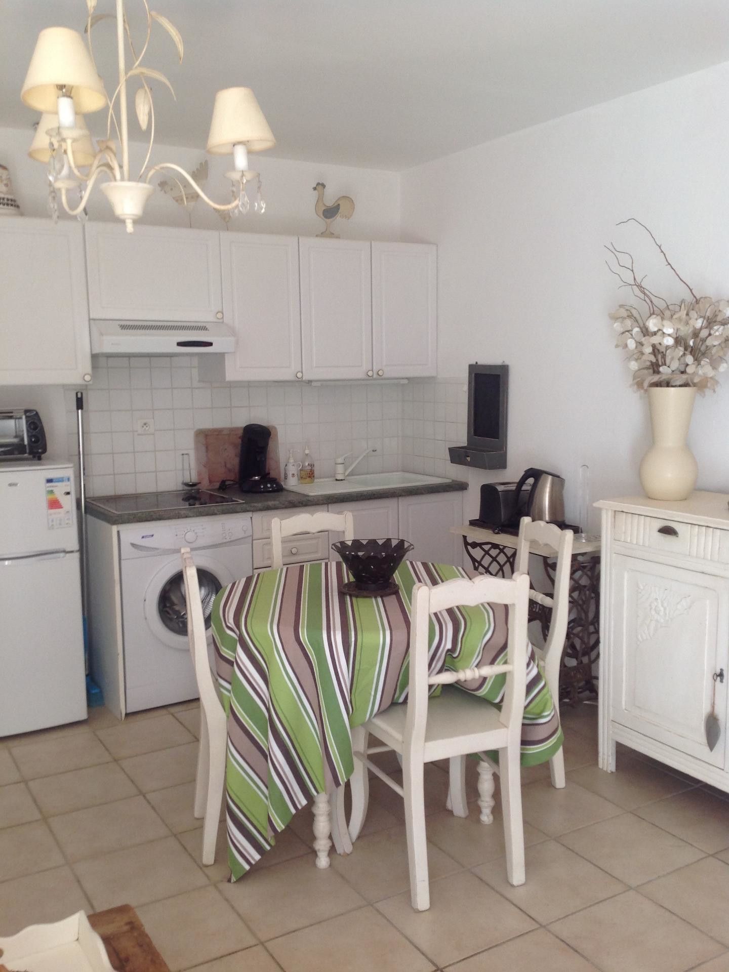 Notre petite maison de deux pièces située au coeur du village, comporte, en rdc, une pièce avec cuisine équipée ( four, micro-ondes, plaques induction, hotte, cafetière dolce gusto, grille-pain et bouilloire)et w.c. A l'étage se trouve une chambre avec un lit 2 places (140x 190, possibilité d'ajouter un lit une place(80x190),et une salle d'eau. Lit parapluie pour bébé à disposition.