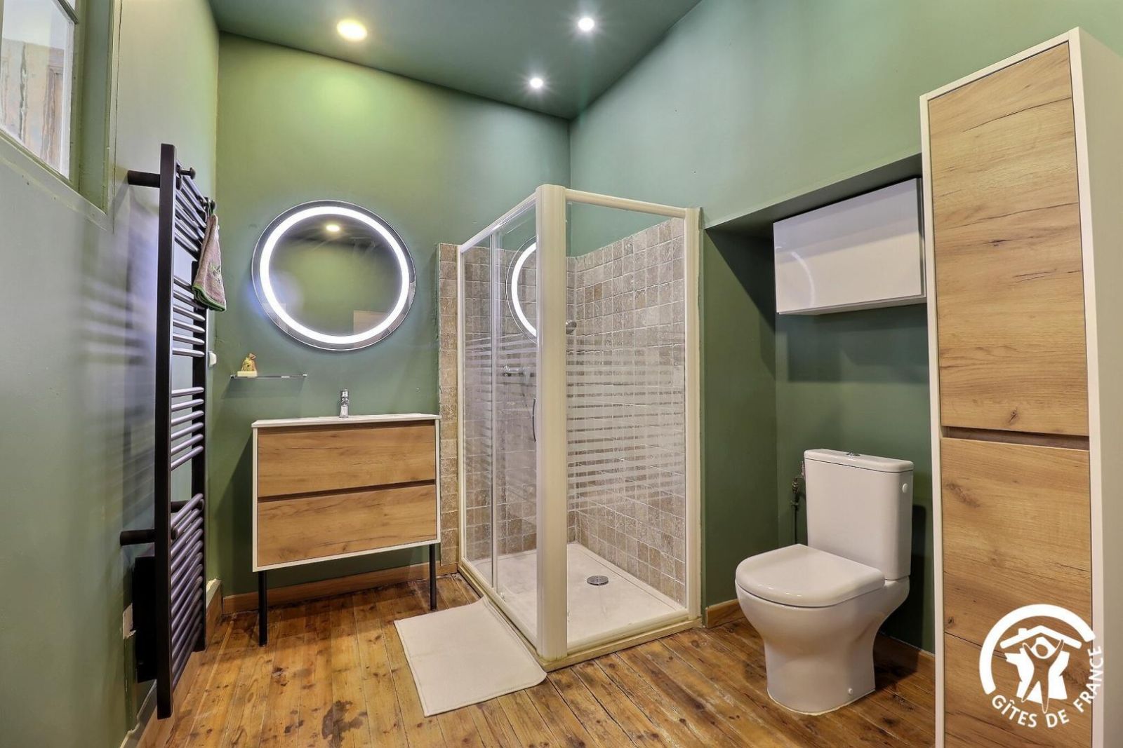 - Salle d'eau avec douche à l'italienne 120x80cm, vasque, porte-serviettes chauffant, WC, miroir éclairant et colonne de rangement.