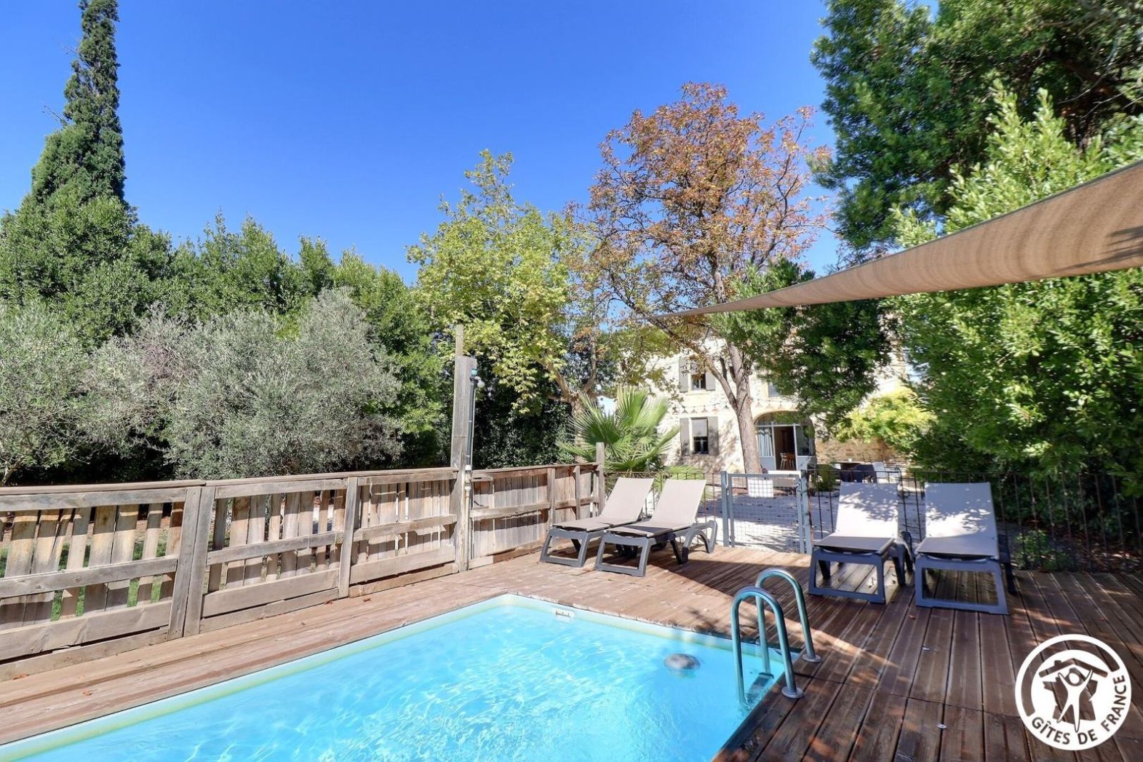 Grand jardin d'environ 1500 m² arboré avec champ d'oliviers et belle terrasse de 225 m² ombragée par les platanes, terrasse couverte avec salons de jardin et braséro. Piscine 3x4m, profondeur 1,3m, accessible de mi-juin à fin septembre.