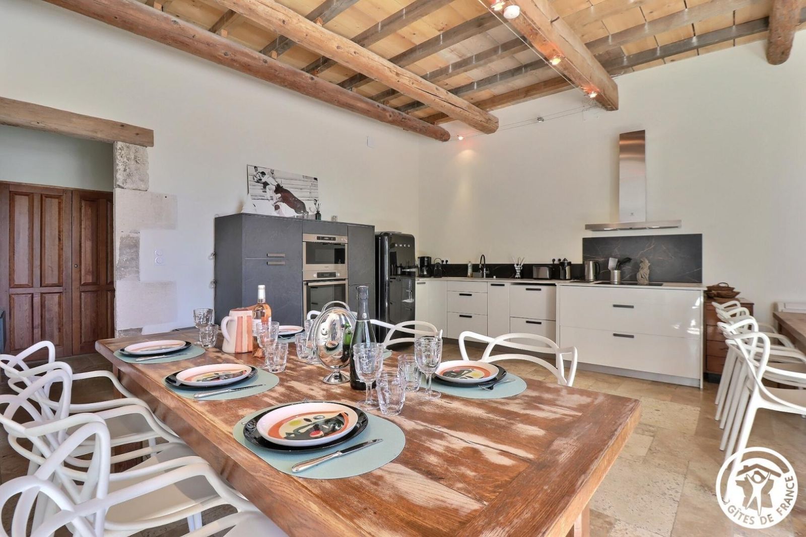 - Cuisine avec 2 tables et 12 chaises, cuisine équipée intégrée avec 3 feux induction, hotte, réfrigérateur SMEG, four, micro-ondes, lave-vaisselle et cafetière à dosettes Nespresso.