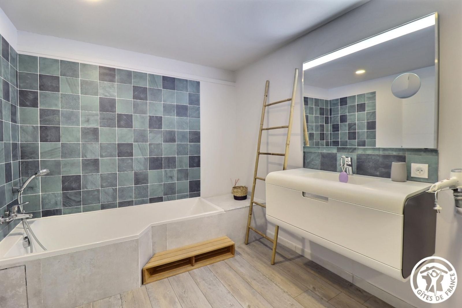 - Salle de bain avec baignoire à hauteur réduite (accès facilité) et grande largeur, vasque, porte-serviettes chauffant, douche à l'italienne avec thermostatique 180x90cm et WC.