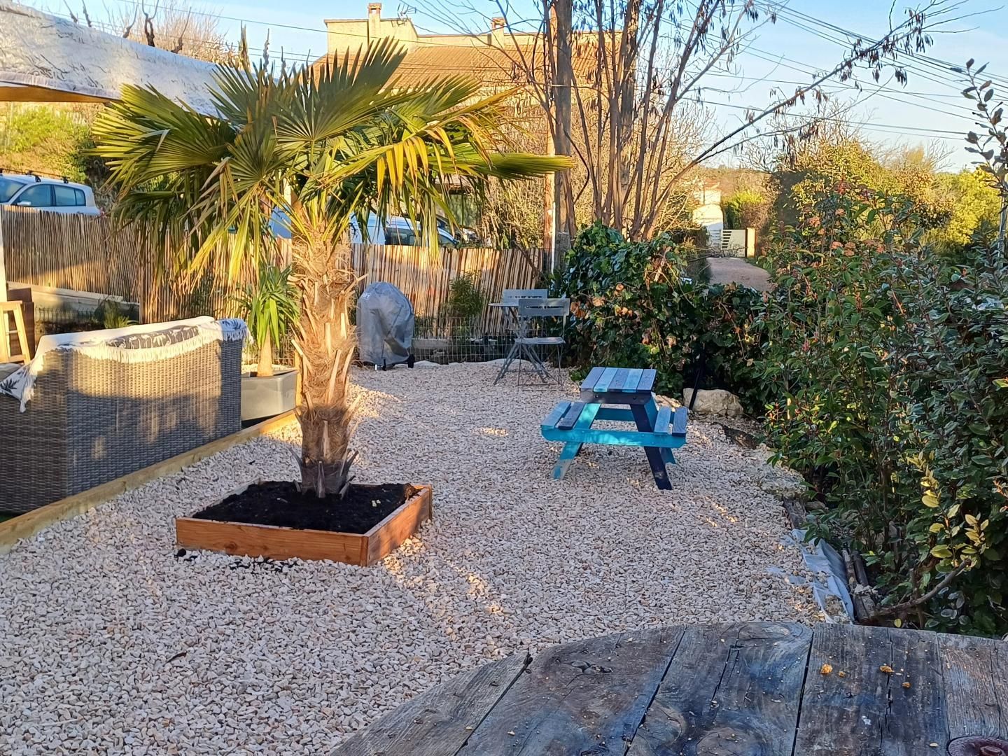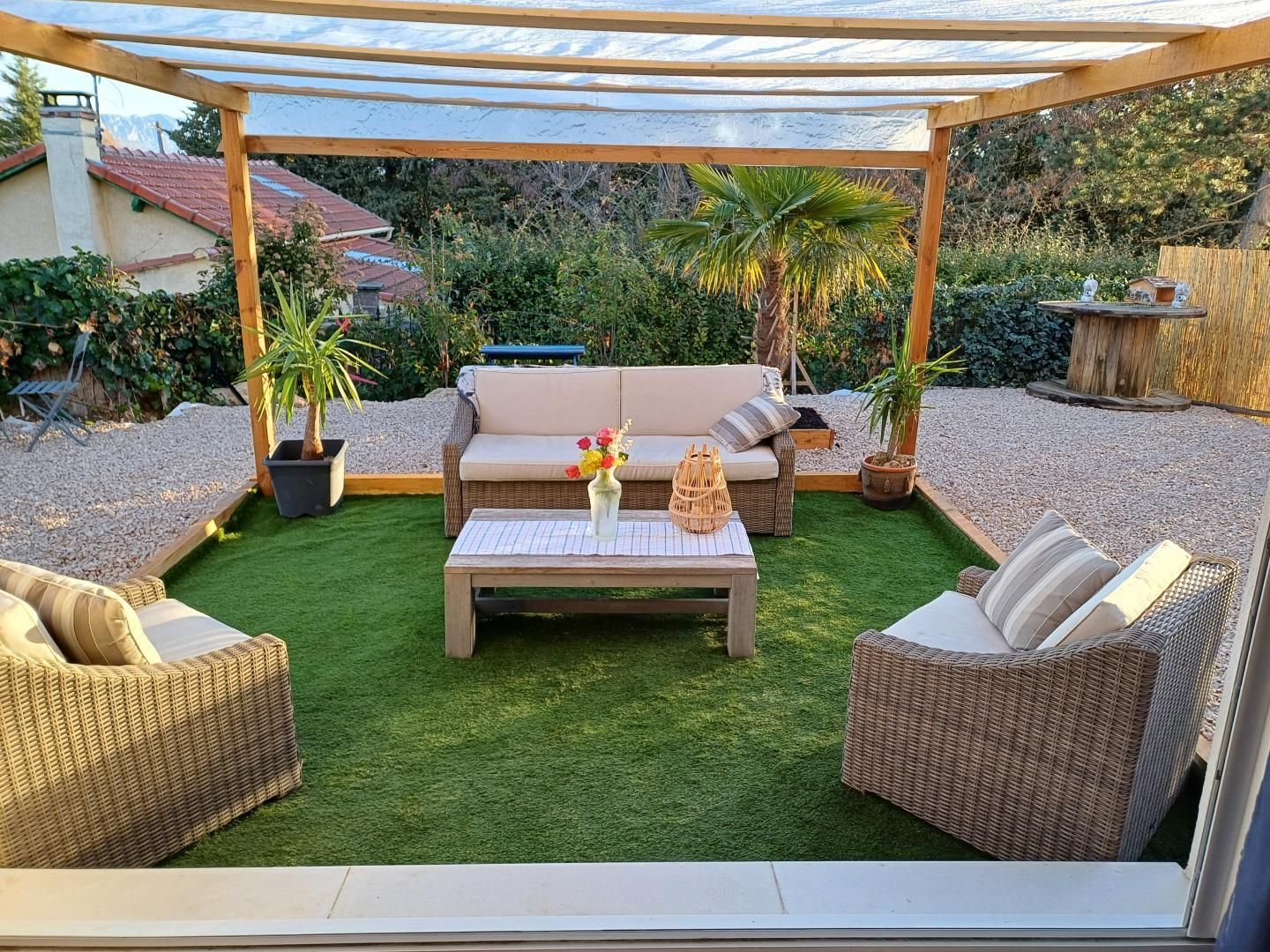 A l'extérieur, terrain clos et terrasse avec pergola. Possibilité de garer 2 véhicules devant la maison.