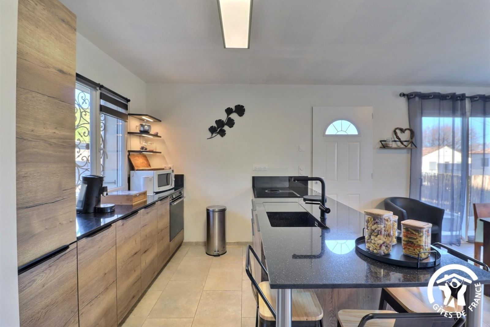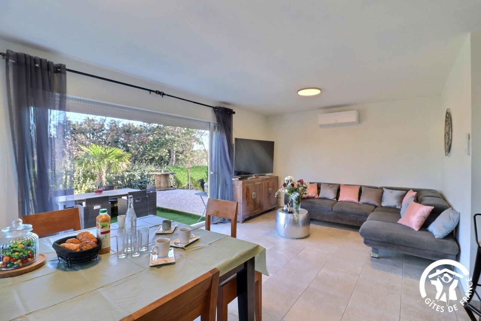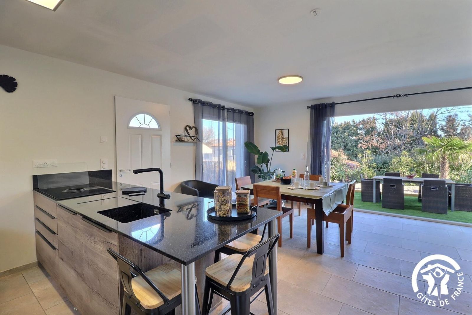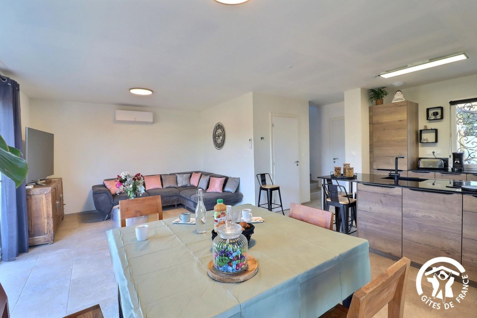 - Une grande pièce de vie, donnant sur la terrasse par une baie vitrée. Cuisine équipée ouverte sur séjour : plaques induction avec hotte intégrée, four, micro-ondes, réfrigérateur/congélateur, lave-vaisselle. Table en bois avec chaises et tabourets, canapé d'angle convertible et grande TV.