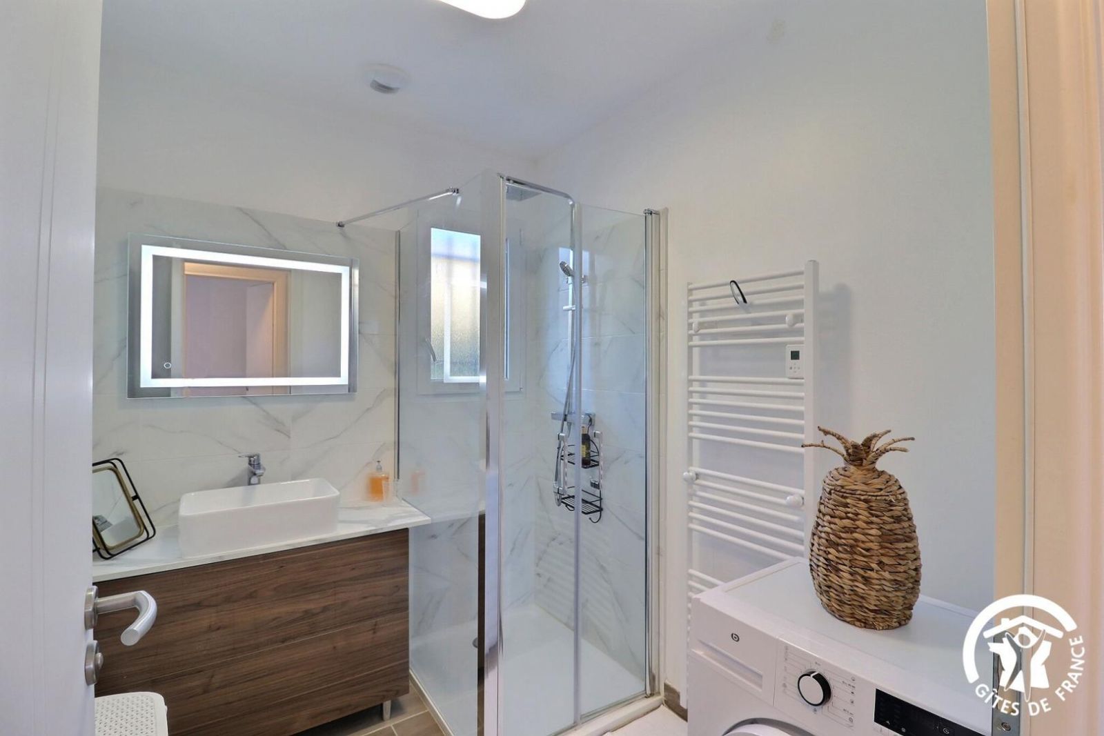 - Salle d'eau avec douche type italienne, vasque, sèche-serviettes, lave-linge, lampe-enceinte bluetooth.