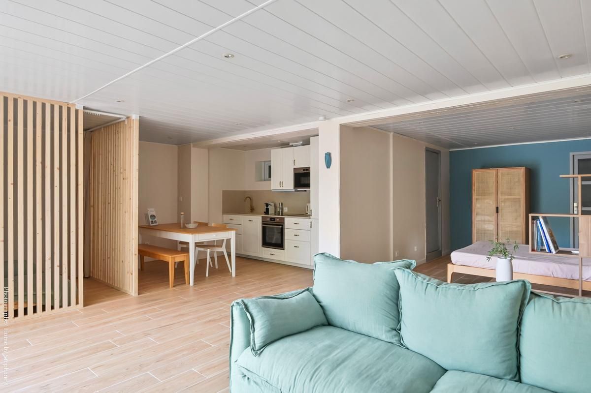- d'une grande pièce de vie avec coin salon : canapé et table basse, d'une cuisine : réfrigérateur/congélateur, micro-ondes, four, lave-vaisselle, 3 feux induction, hotte aspirante, cafetière Nespresso. Table avec 2 chaises et 1 banc, TV écran plat, coin bibliothèque. Espace nuit avec lit 160x190cm et armoire de rangement et un deuxième coin chambre avec 2 lits simple