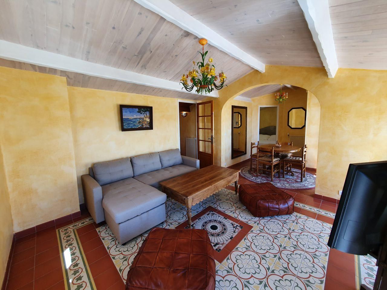 Séjour : canapé convertible, tv, table et chaise salle à manger,