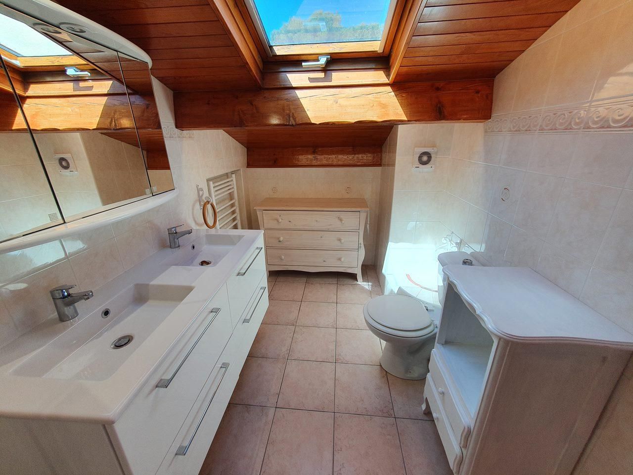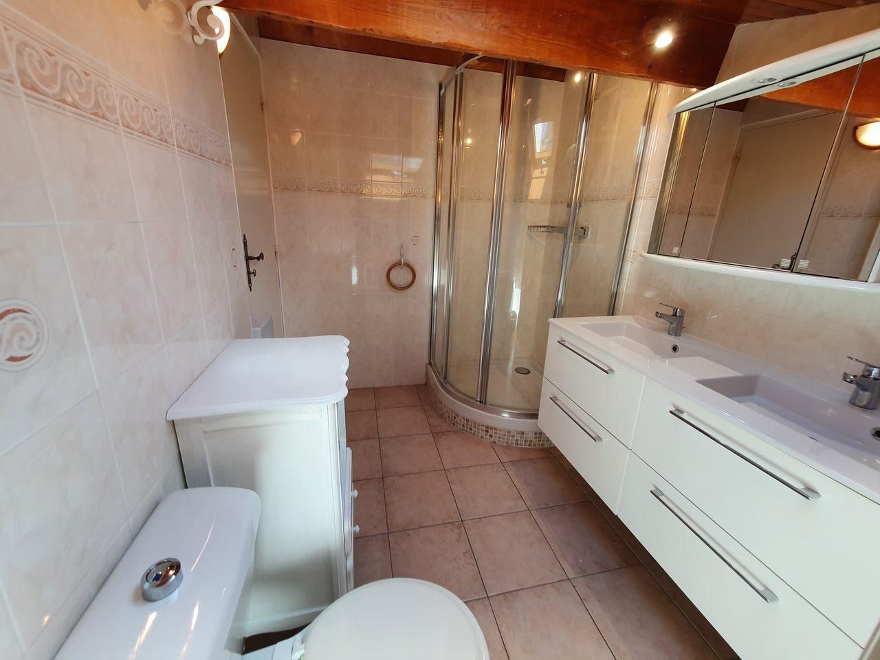 Salle de bain : douche, WC, sèche-cheveux, serviettes de bain