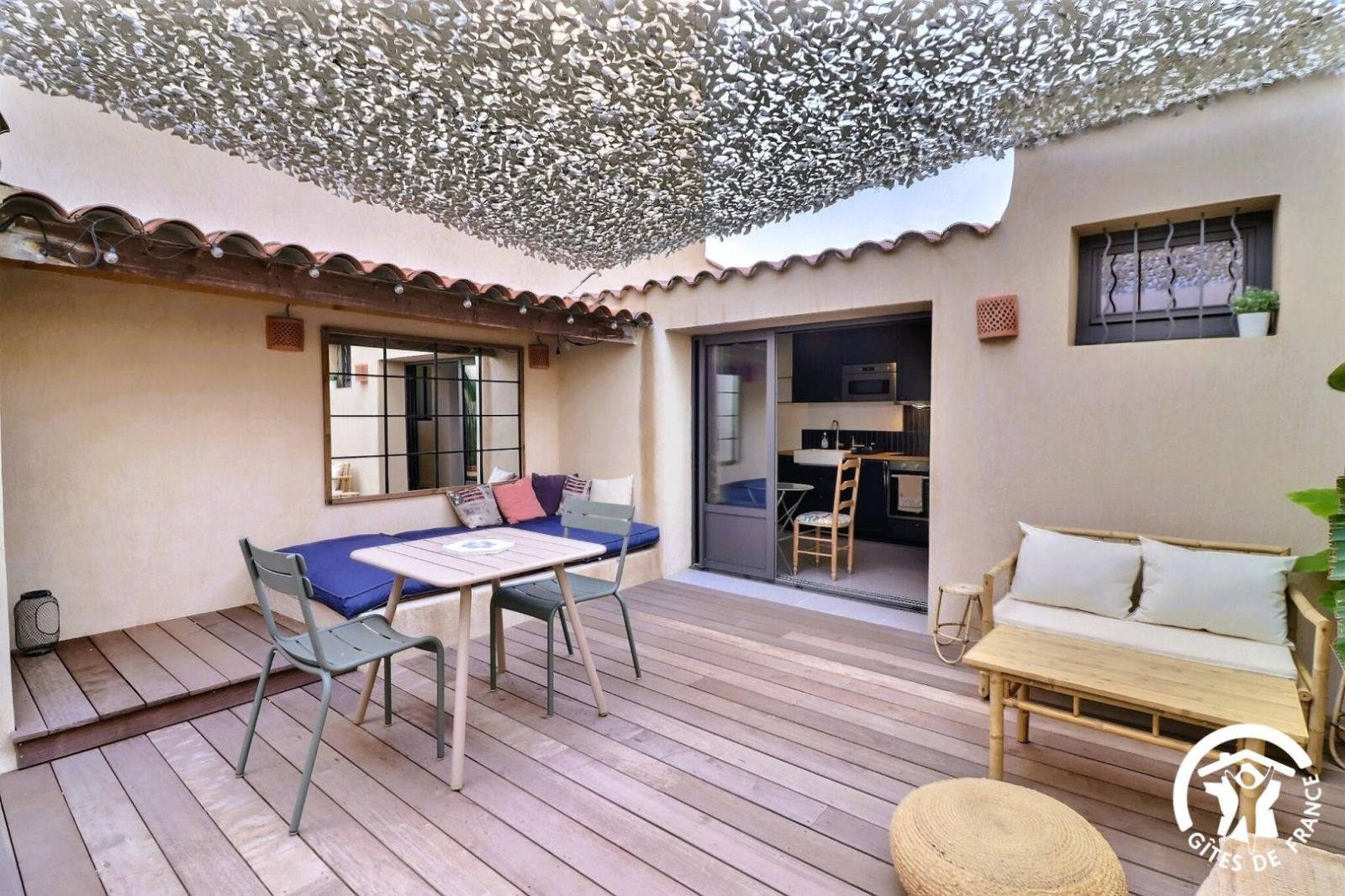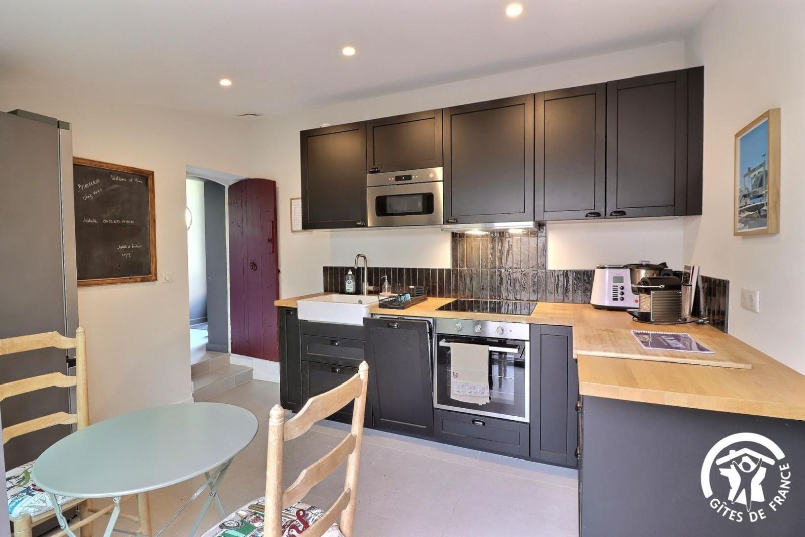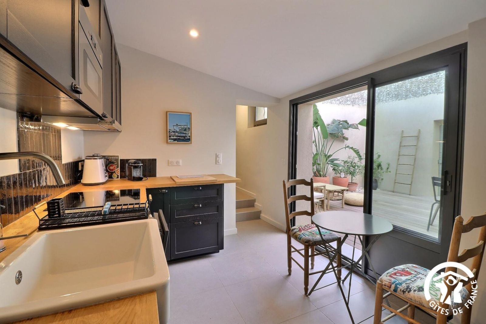 - Cuisine équipée donnant accès à la cour privative avec table et deux chaises, plaque de cuisson 4 feux inductions, hotte aspirante, four, micro-onde, réfrigérateur-congélateur, robot de cuisine, machine à café à dosettes et à filtre etc.