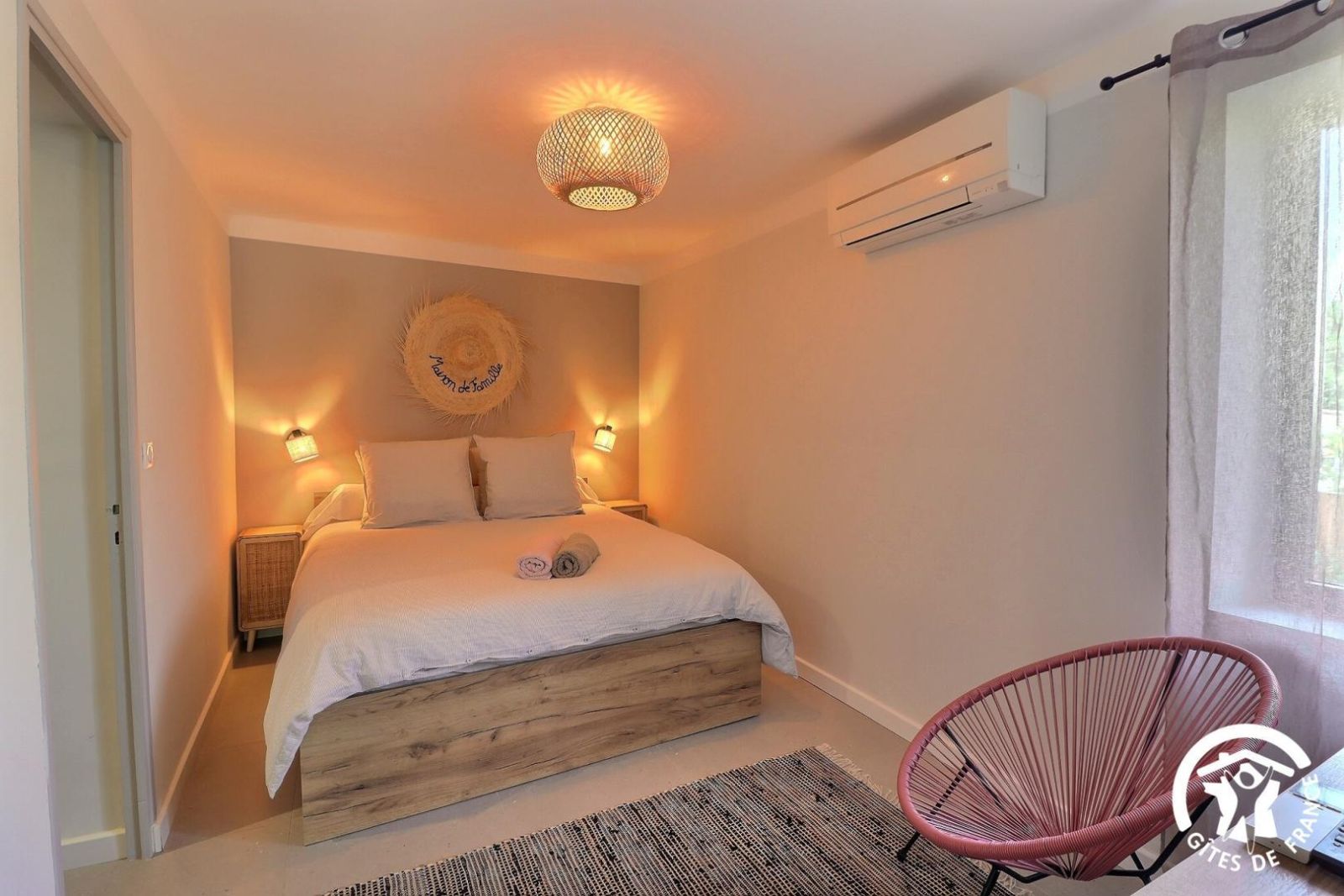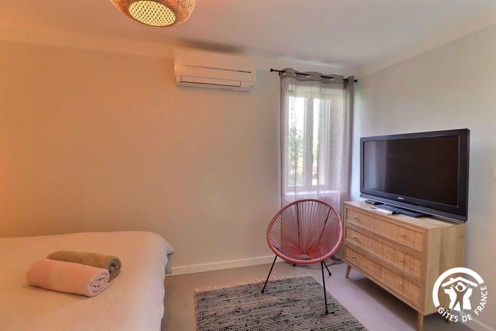- Une chambre climatisée avec un lit 160x200, une commode et une TV