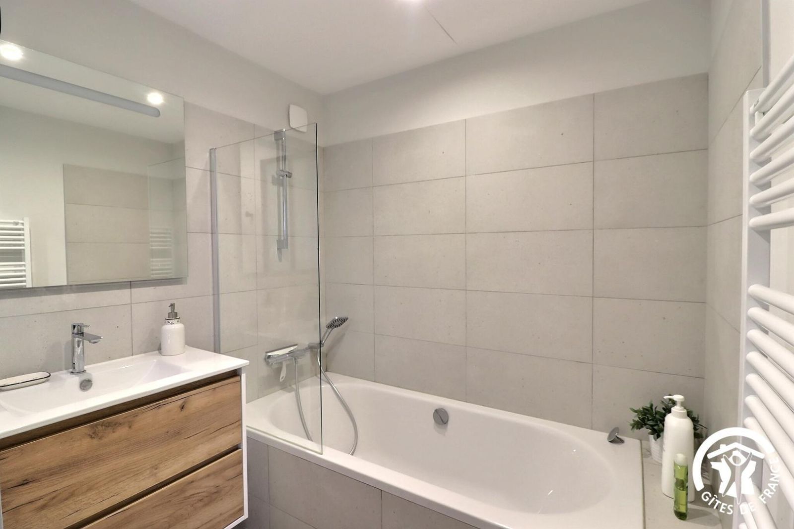 - Une salle de bain avec meuble vasque, douche avec pare-douche et sèche-serviette chauffant
