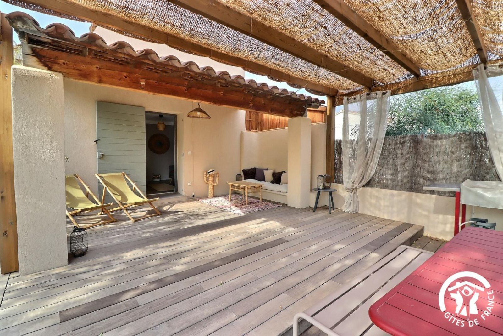 Mitoyen à la villa des propriétaires, il offre tout le confort nécessaire pour des vacances en toute tranquillité. Il dispose d'une cour privative pour prendre vos repas en extérieur ou simplement vous détendre, et d'une terrasse dans le jardin des propriétaire donnant accès à une piscine partagée accessible de 10h à 12h et de 15h à 19h (3,5x10m, fond plat 1m40 de profondeur, au sel et protégée par un volet roulant)