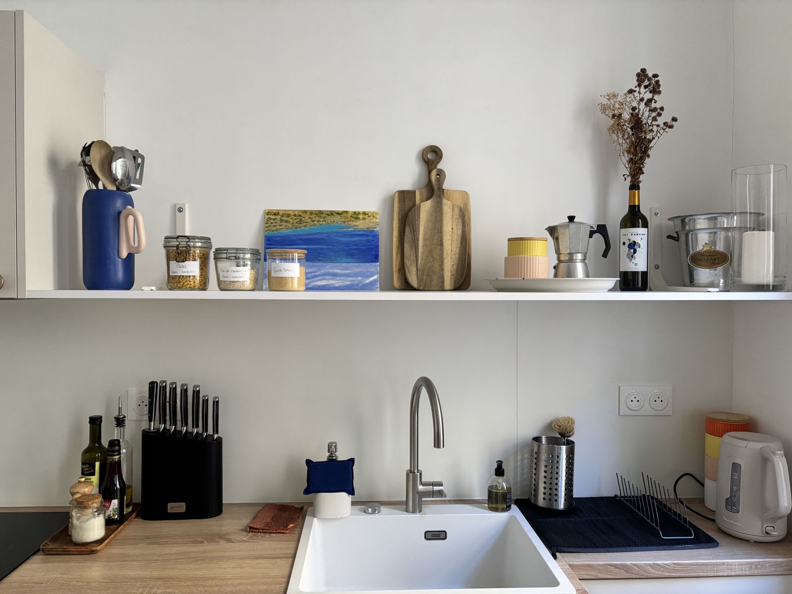 - Cuisine : réfrigérateur, congélateur, lave vaisselle, bouilloire, grille pain, machine à café piston et moka. Café, thé et infusions, riz, pâtes et muesli toujours à disposition