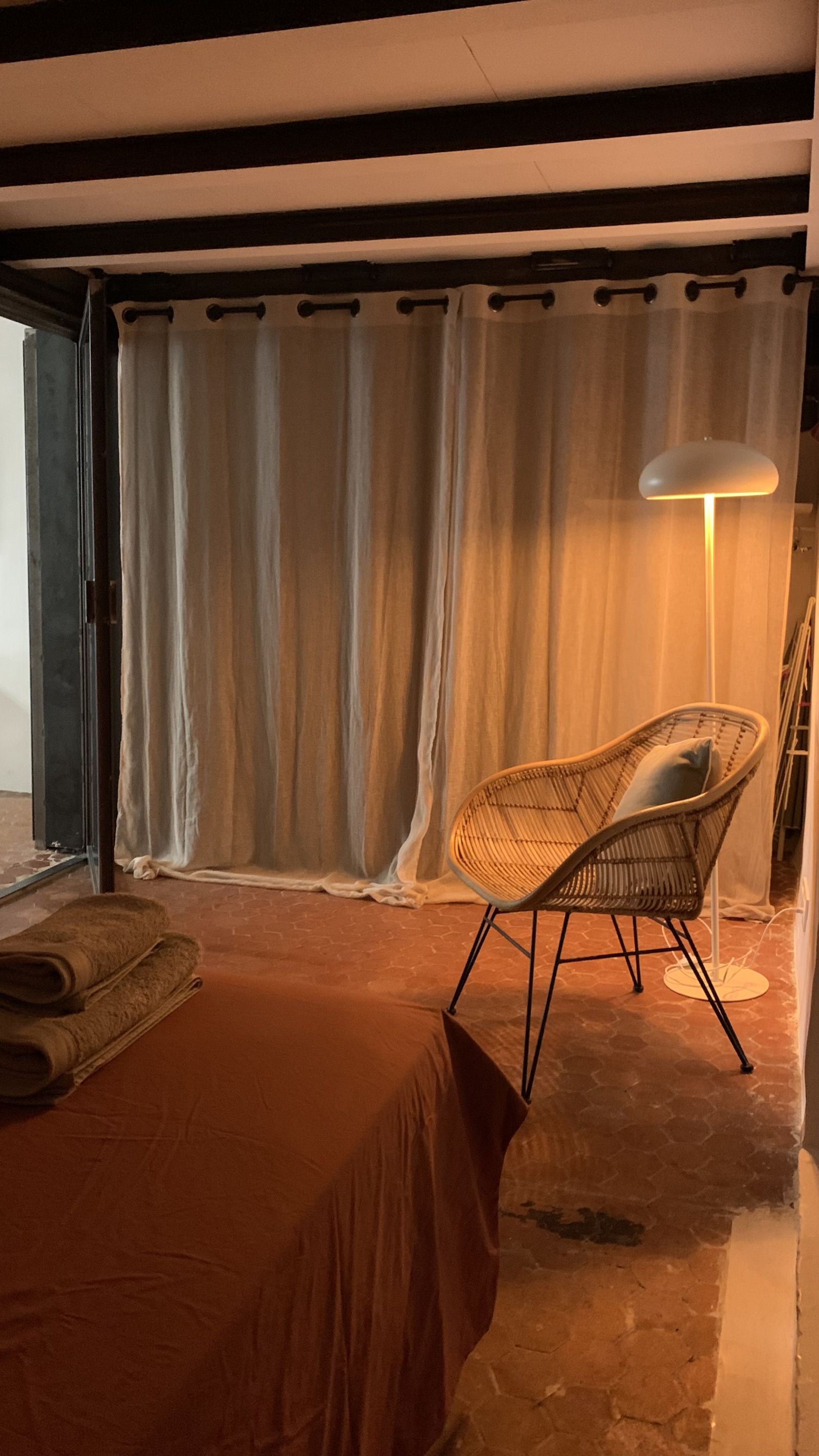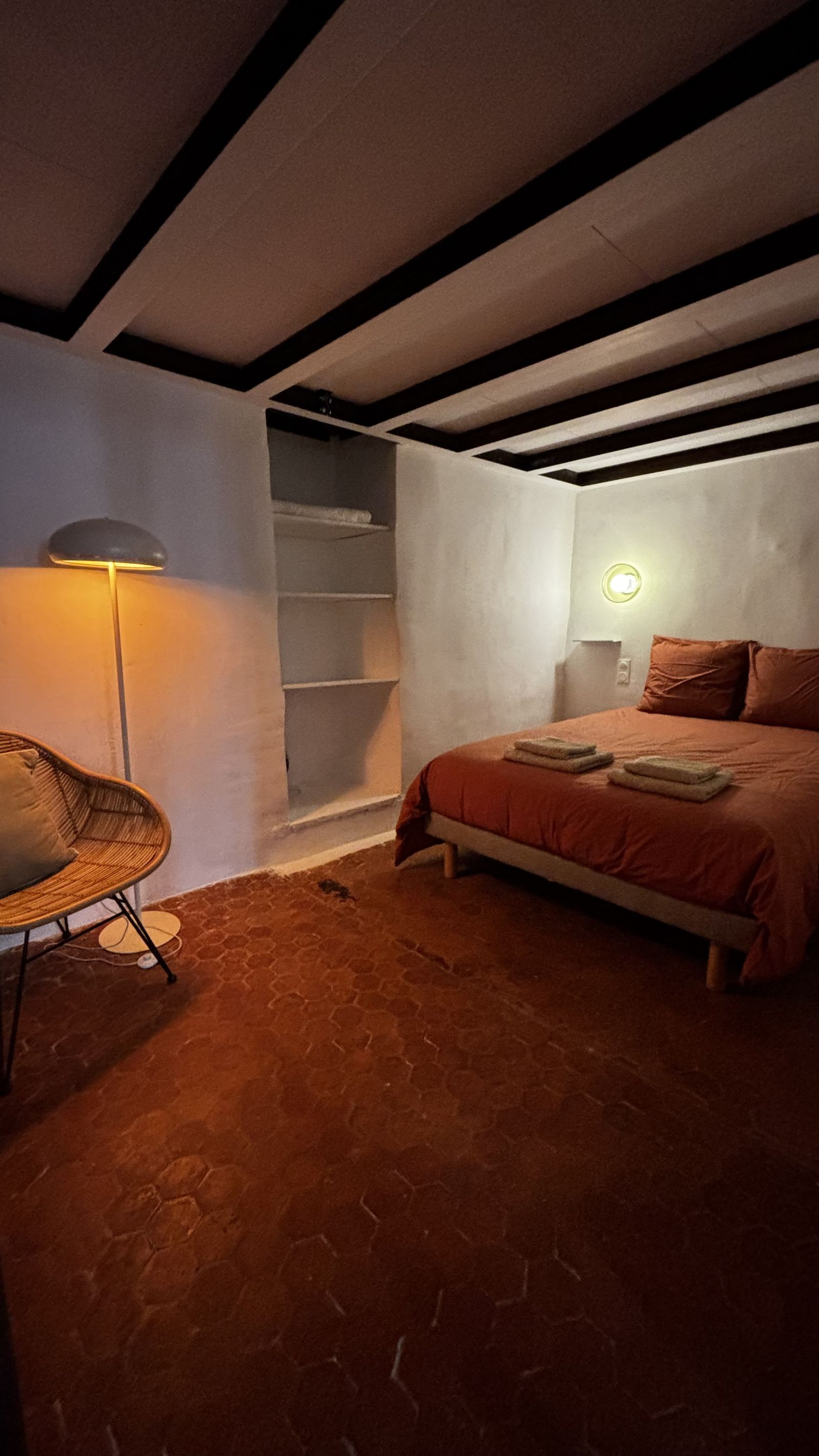 - Chambre 1 : lit double 140cm, linge de lit et de bain. Petit dressing et étagère