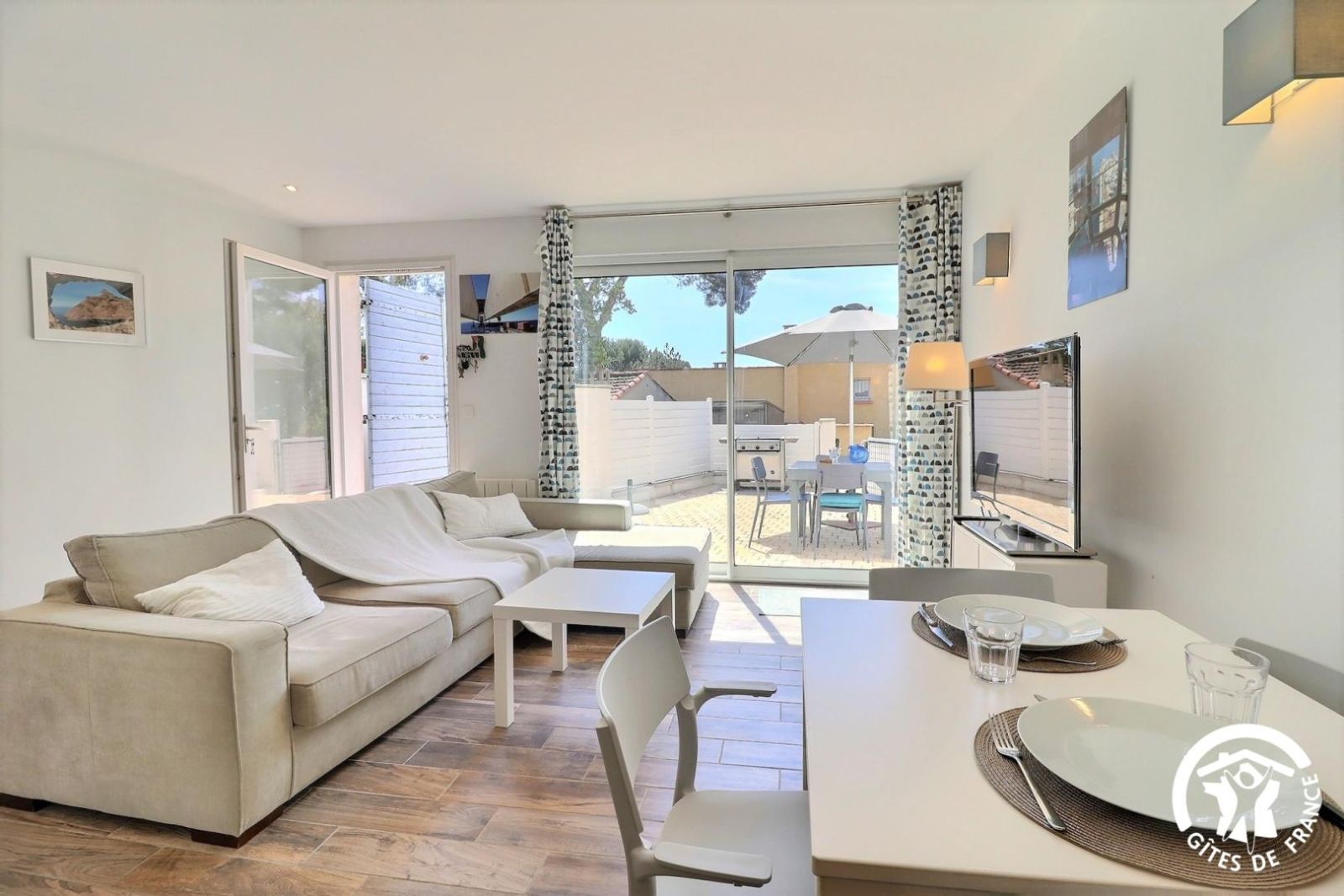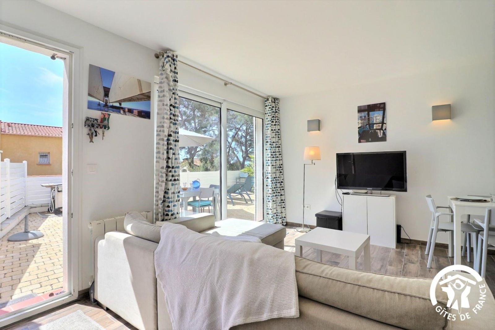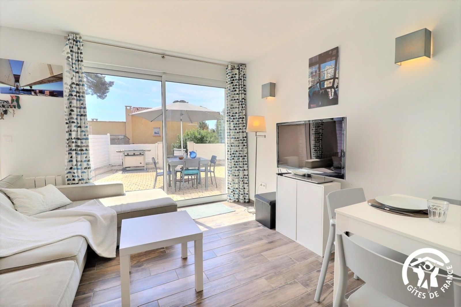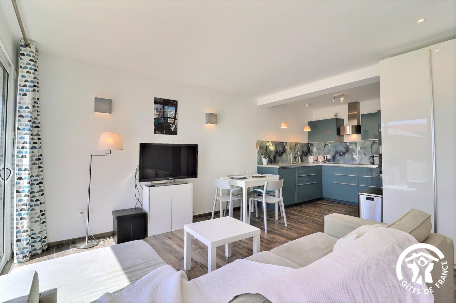 - Un séjour lumineux avec salon (canapé d'angle convertible - 2 couchages d'appoint supplémentaires possibles, TV écran plat), espace repas pour 4 personnes et cuisine équipée (plaque 3 feux induction, hotte, lave-vaisselle, four, micro-ondes, réfrigérateur/congélateur et lave-linge). Baie vitrée donnant sur la terrasse privative avec vue mer.