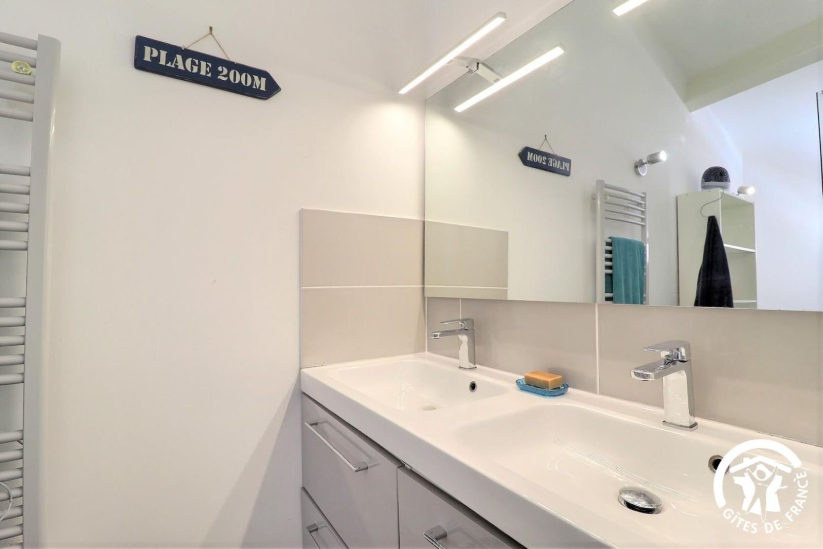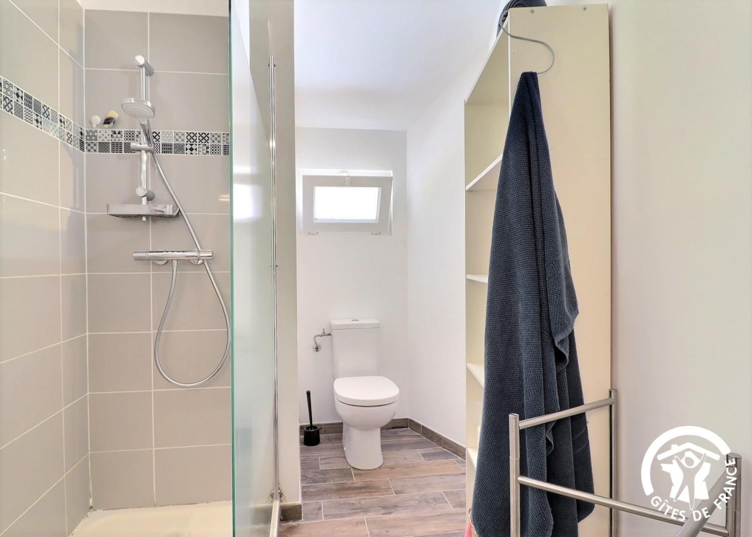 - Une salle d'eau avec douche type italienne 80x120cm, double vasque, porte-serviettes chauffant et WC. Terrasse privative de 40 m² avec salon de jardin, barbecue gaz, parasol et bains de soleil.