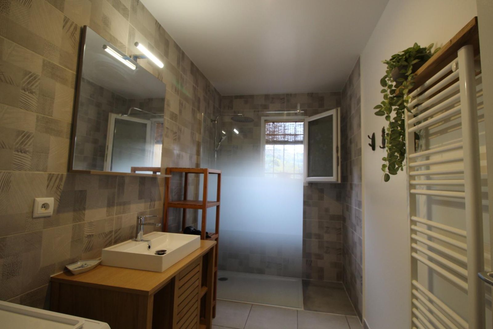 - Salle de bain avec baignoire, vasque, porte-serviettes chauffant et lave-linge.