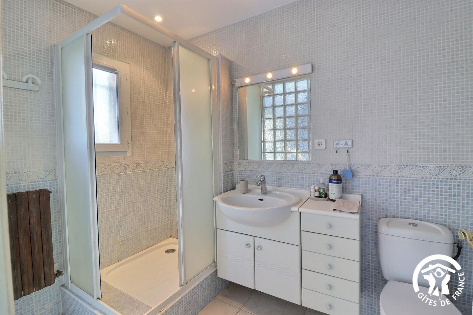 - une salle d'eau avec une douche, un meuble vasque, un WC et une machine à laver