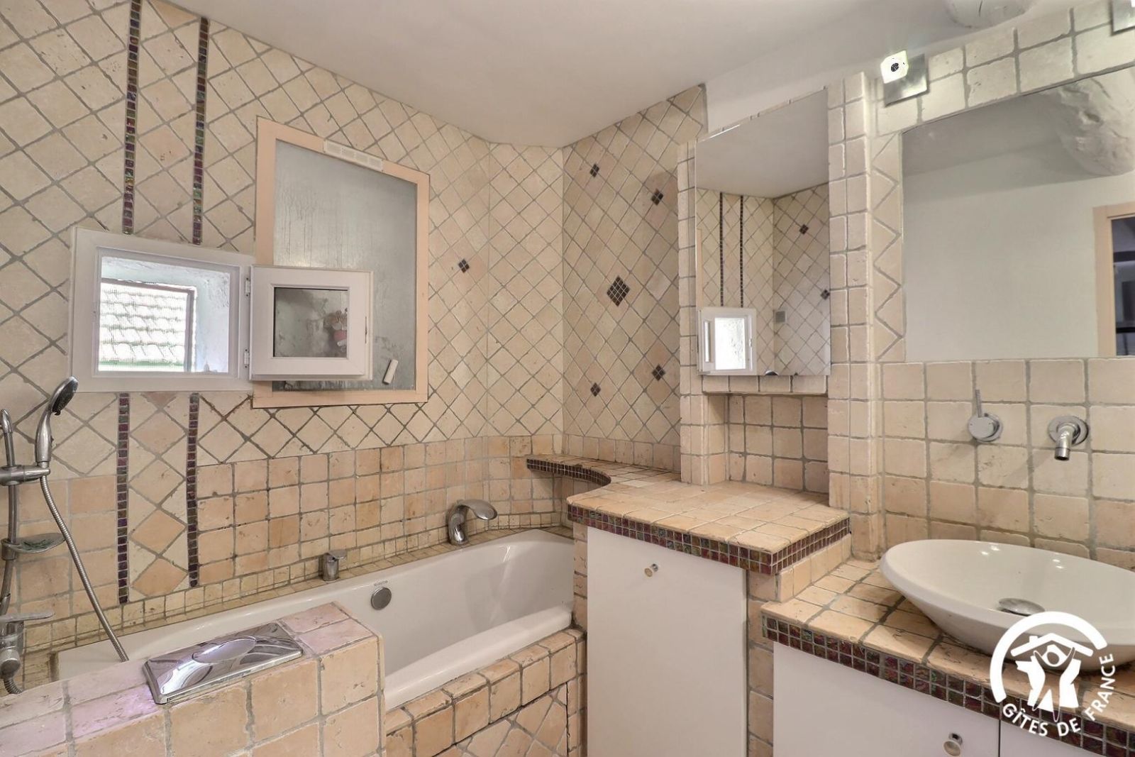 - Salle de bain avec baignoire, vasque avec tiroirs et placard, sèche-serviettes et WC.