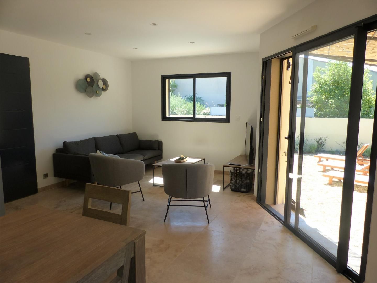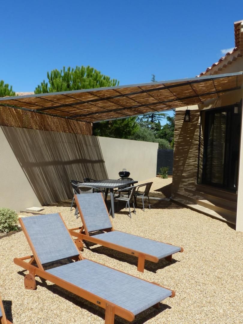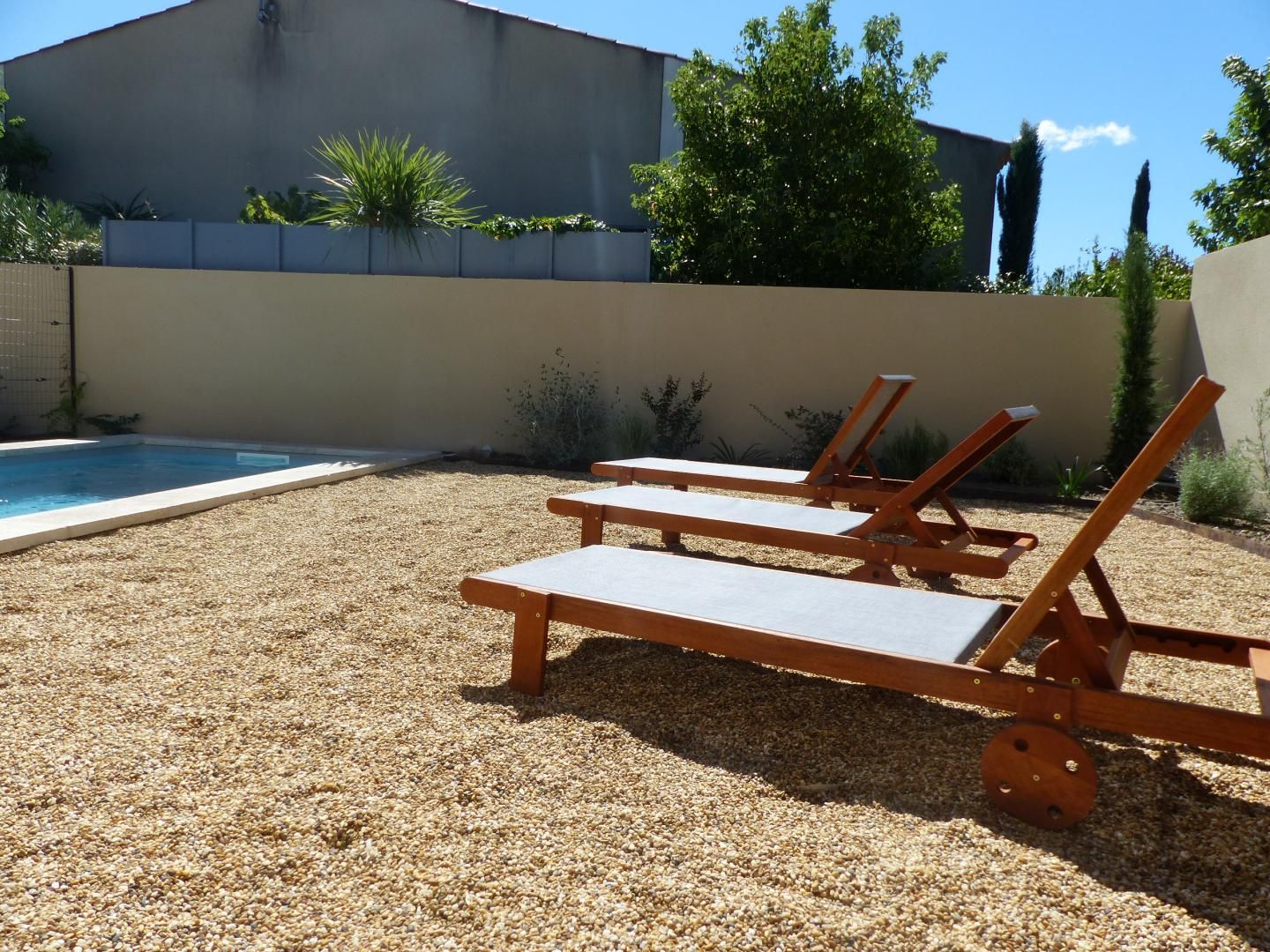 Cour en gravier avec salon de jardin, et ombragée par une pergola. Transat au bord de la piscine. Barbecue. Parking. Wi-fi. Lit et chaise bébé sur demande. Ménage de fin de séjour inclus. Charges comprises : linge, draps, climatisation réversible.