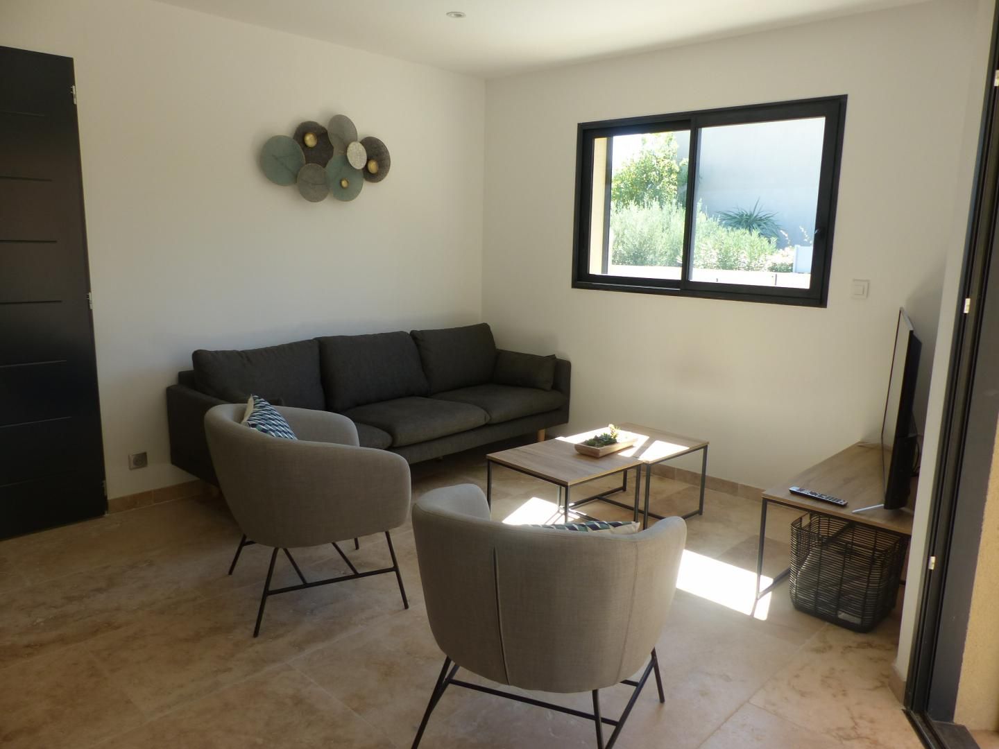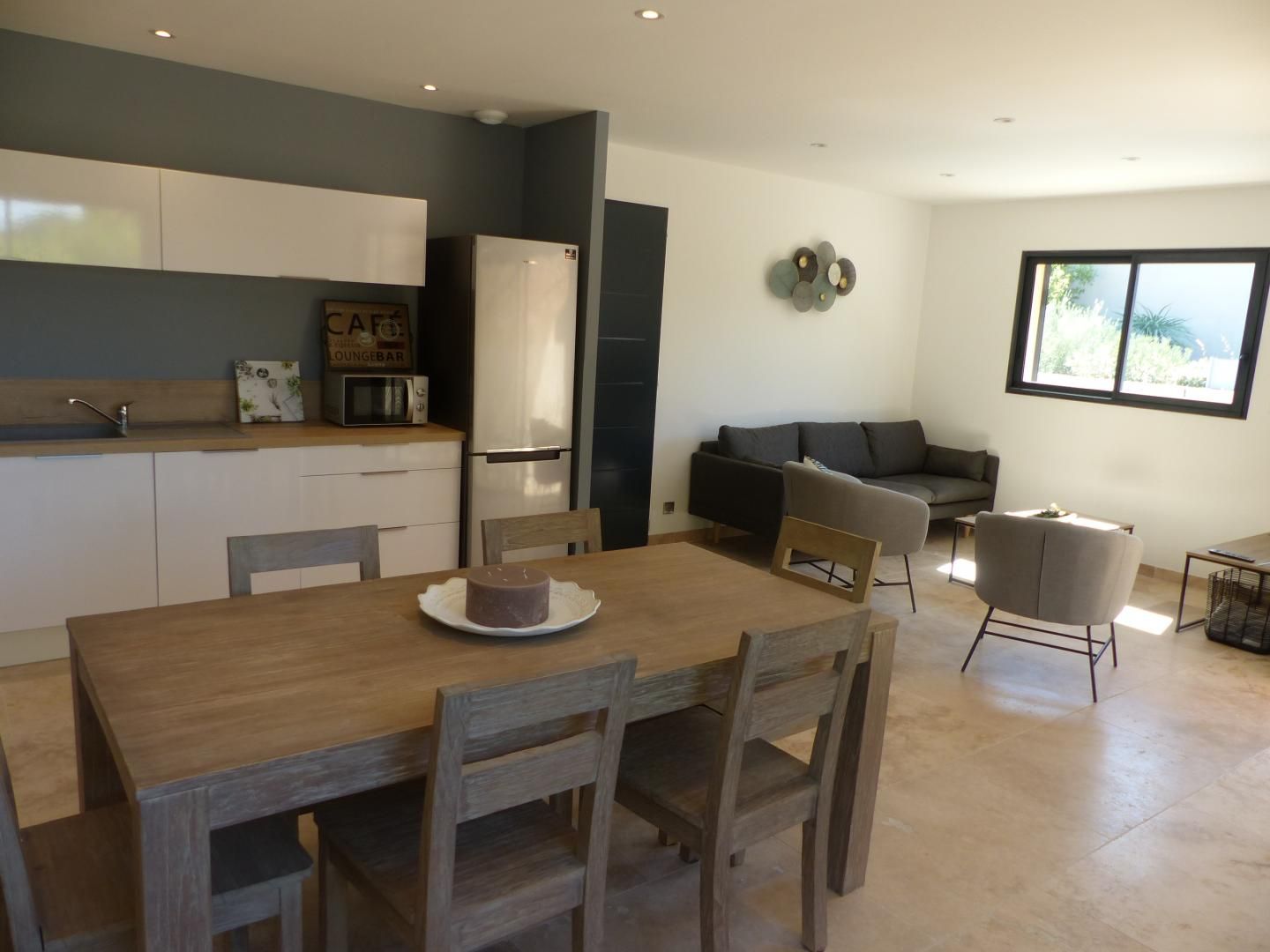 En rez de chaussée (3 marches d'accès) : Belle pièce de vie, lumineuse et spacieuse, avec coin salon détente (canapé, fauteuils et télévision écran plat connectée à la box Orange), espace repas élégant et confortable, cuisine totalement intégrée (lave vaisselle, four, micro ondes, frigo/congélateur, plaques induction, petit électroménager, lave linge).