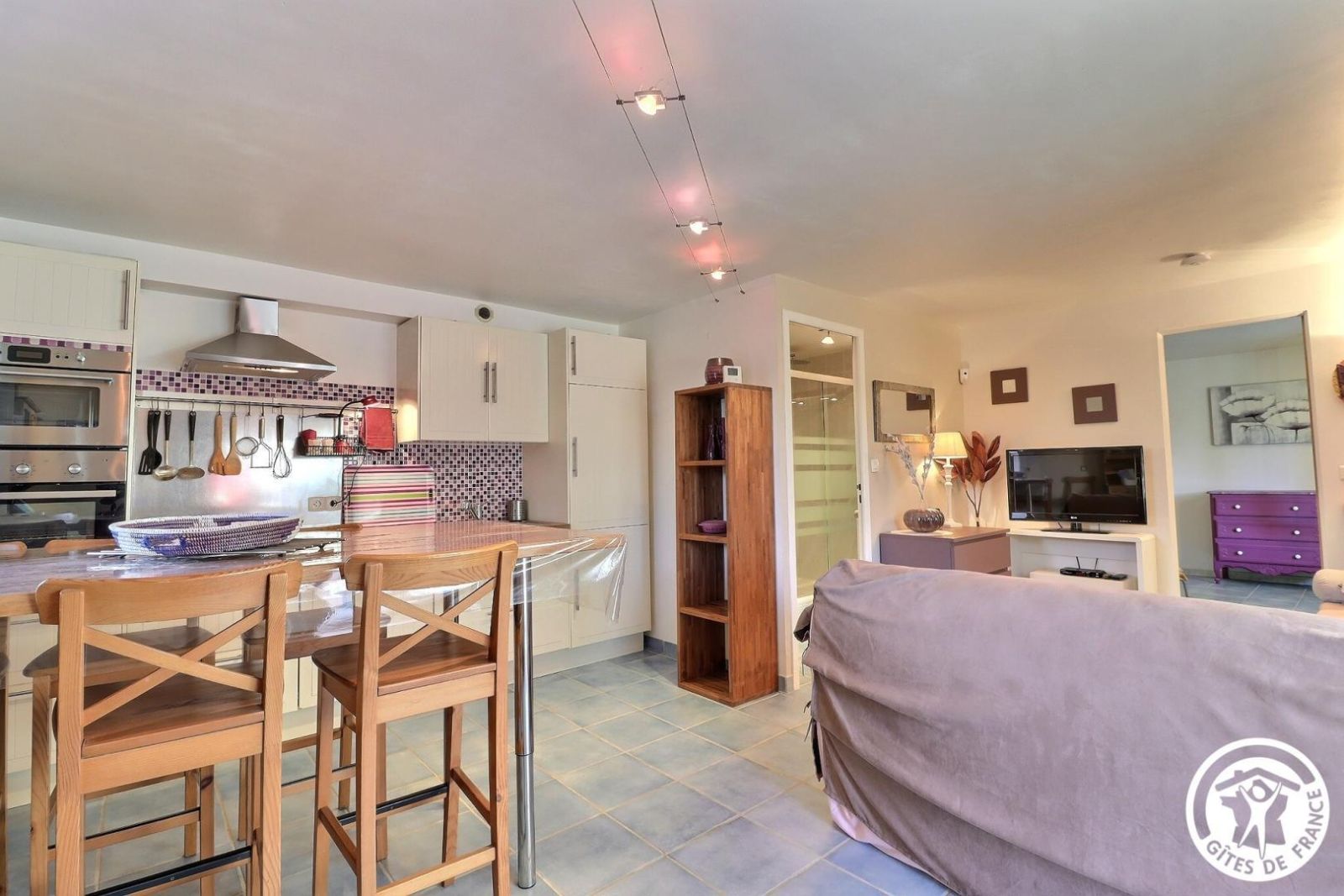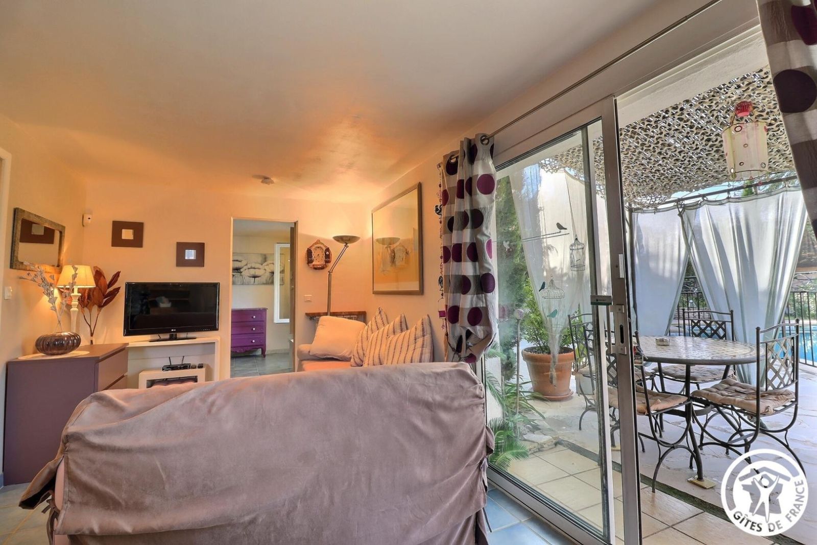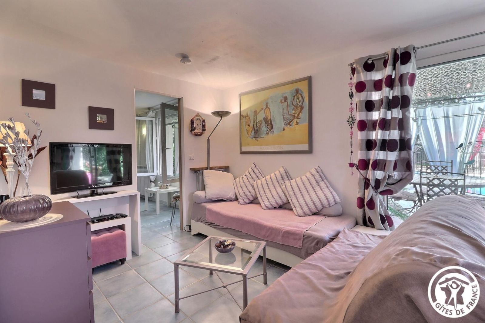 Appartement pour 4 personnes avec très bel espace extérieur fleuri et jolie piscine.
