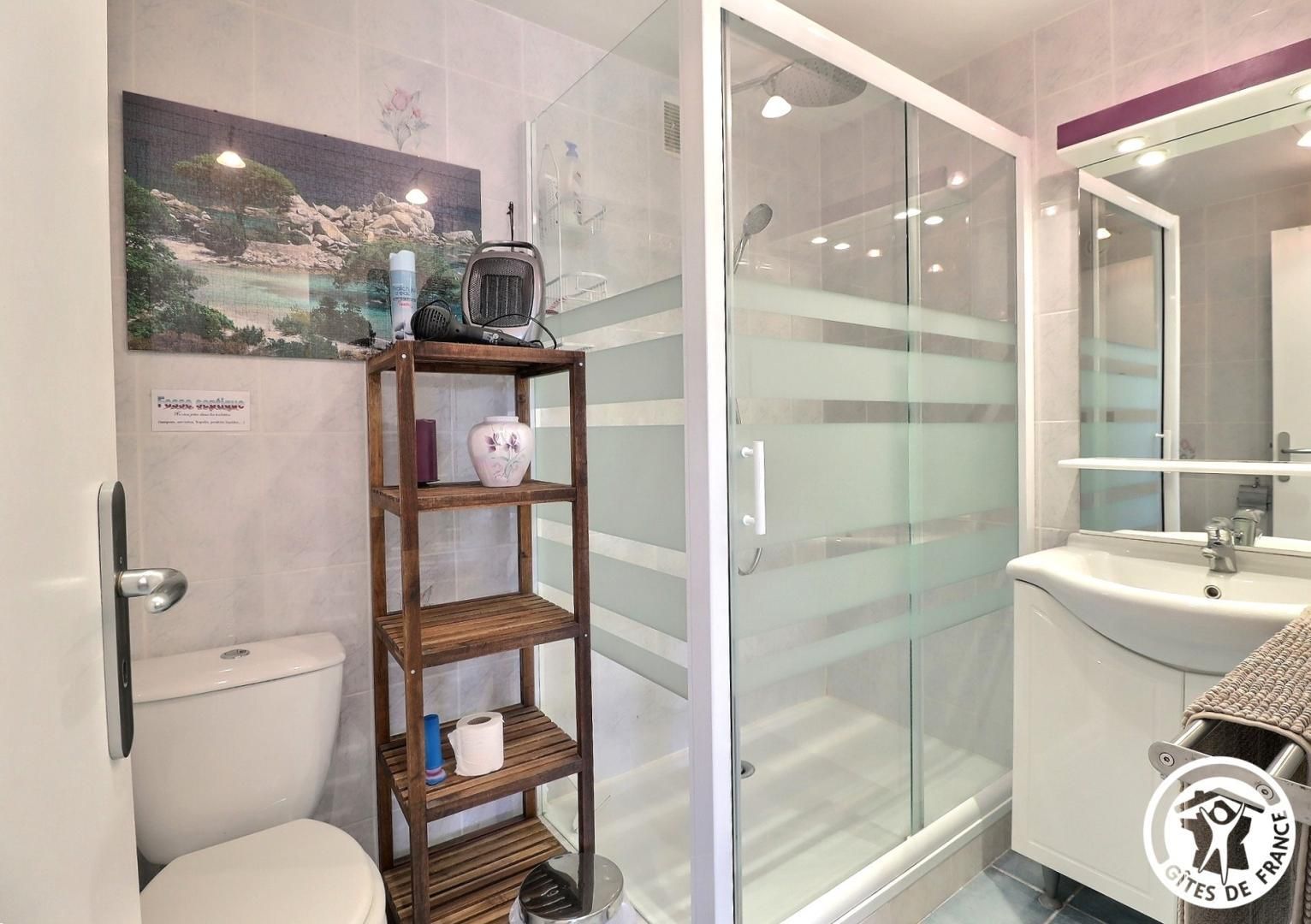 - Salle d'eau proposant une douche 80x110cm, vasque et WC.