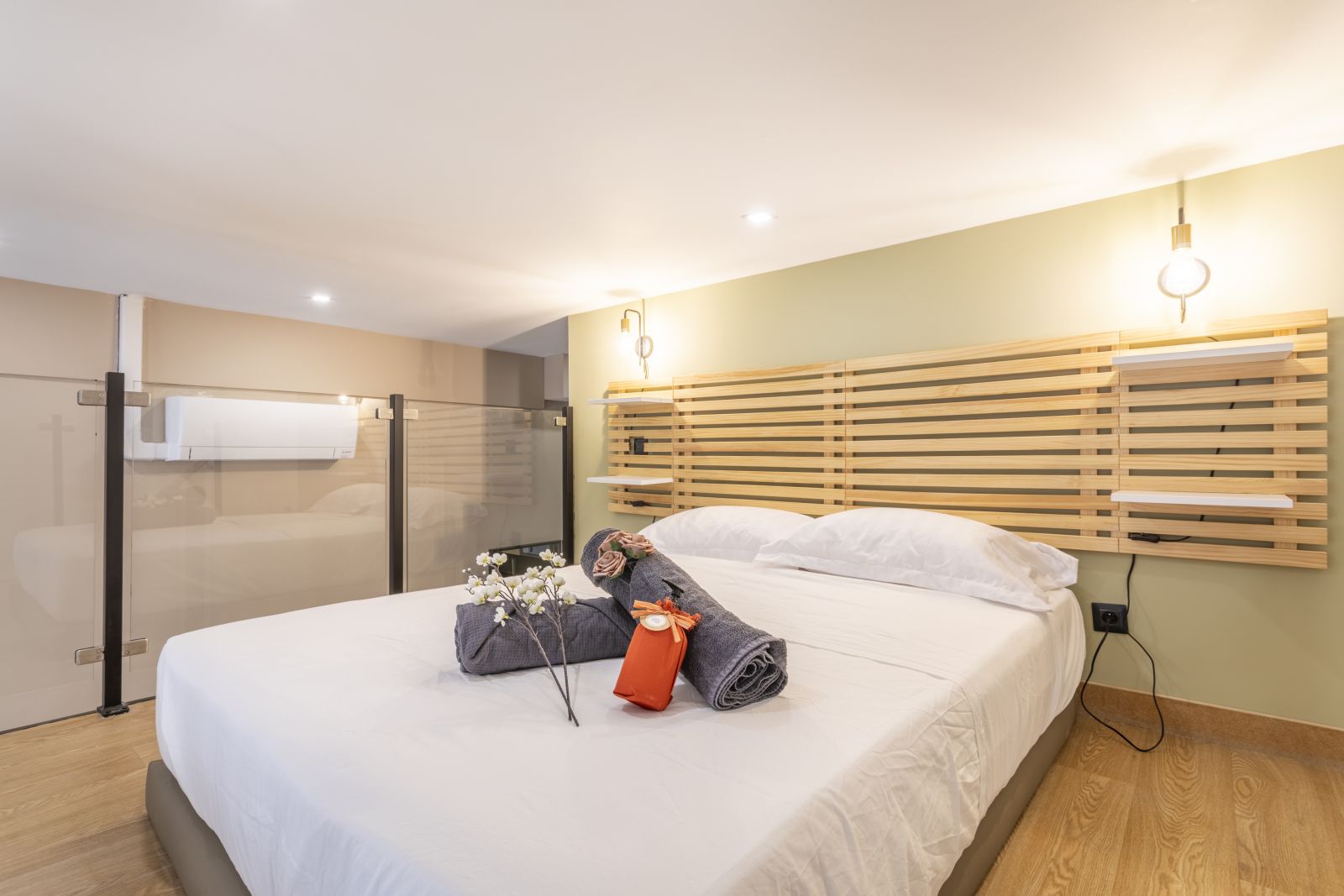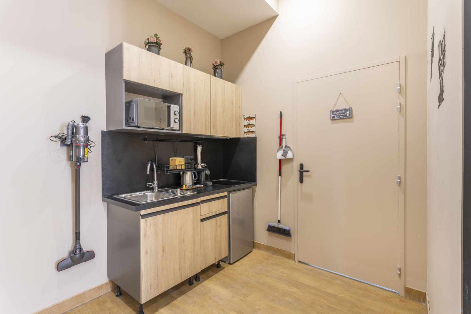 Appartement entièrement équipé. Salon avec canapé-lit 160 matelas de haute qualité. 1 chambre avec lit double(140x190cm) en mezzanine et 1 chambre avec lit double (160x200cm) séparé. Linge de lit, serviettes de bain et de toilette compris. Cuisine équipée pour la cuisson légère. Verrerie, tasses à café et à thé, couverts. Bouilloire, micro ondes, machine à café et capsules compatibles Nespresso. Nécessaire d'hygiène.