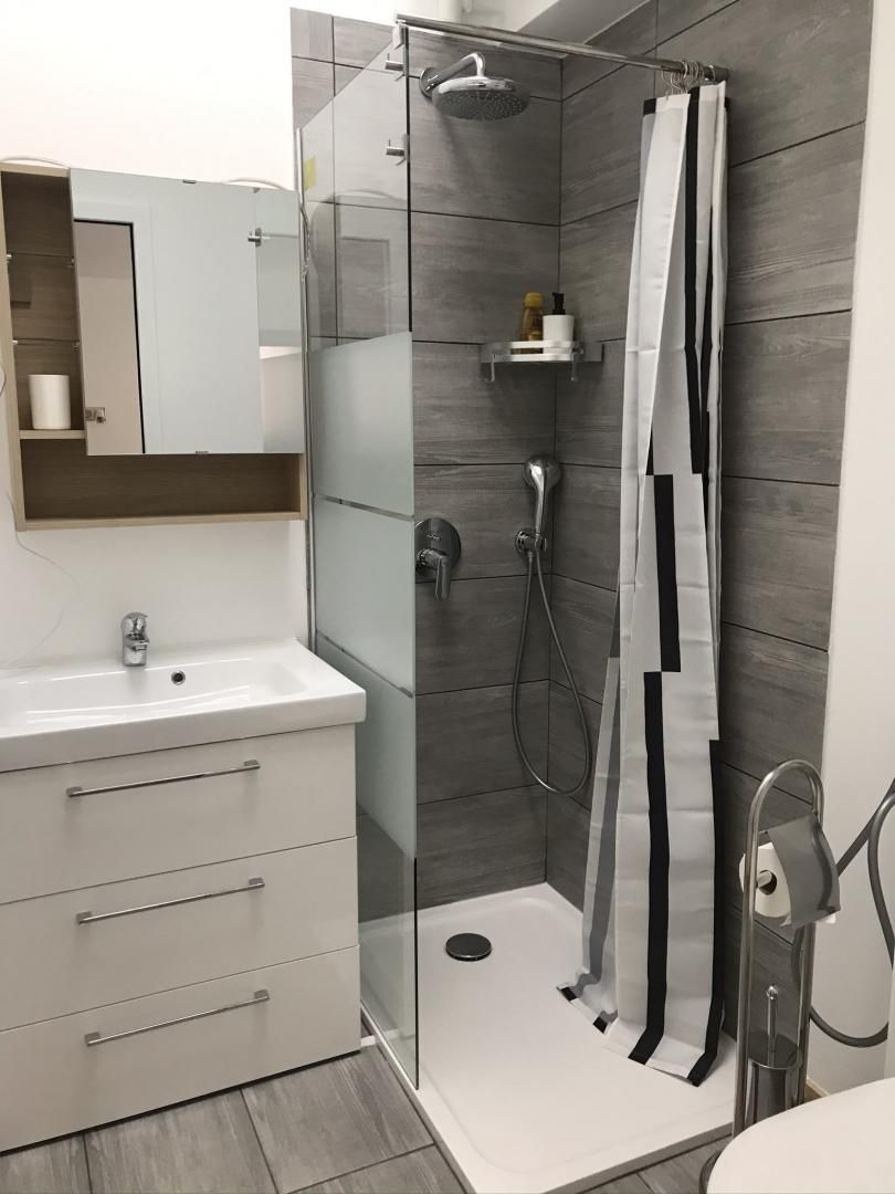 Salle d'eau fermée avec douche à l'italienne 70x100cm, vasque, WC et sèche-serviettes chauffant.