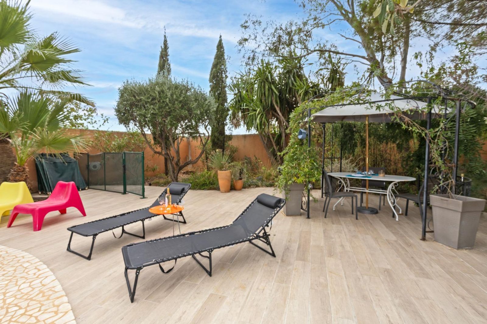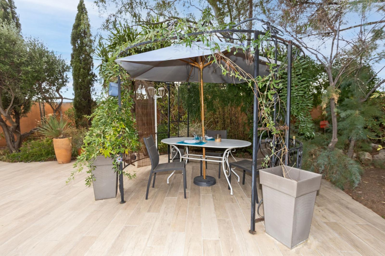 A l'extérieur, une terrasse accessible par le côté cuisine, avec table et fauteuils pour le petit déjeuner du matin, et un autre espace au bord de la piscine, sous la gloriette ombragée, avec barbecue.