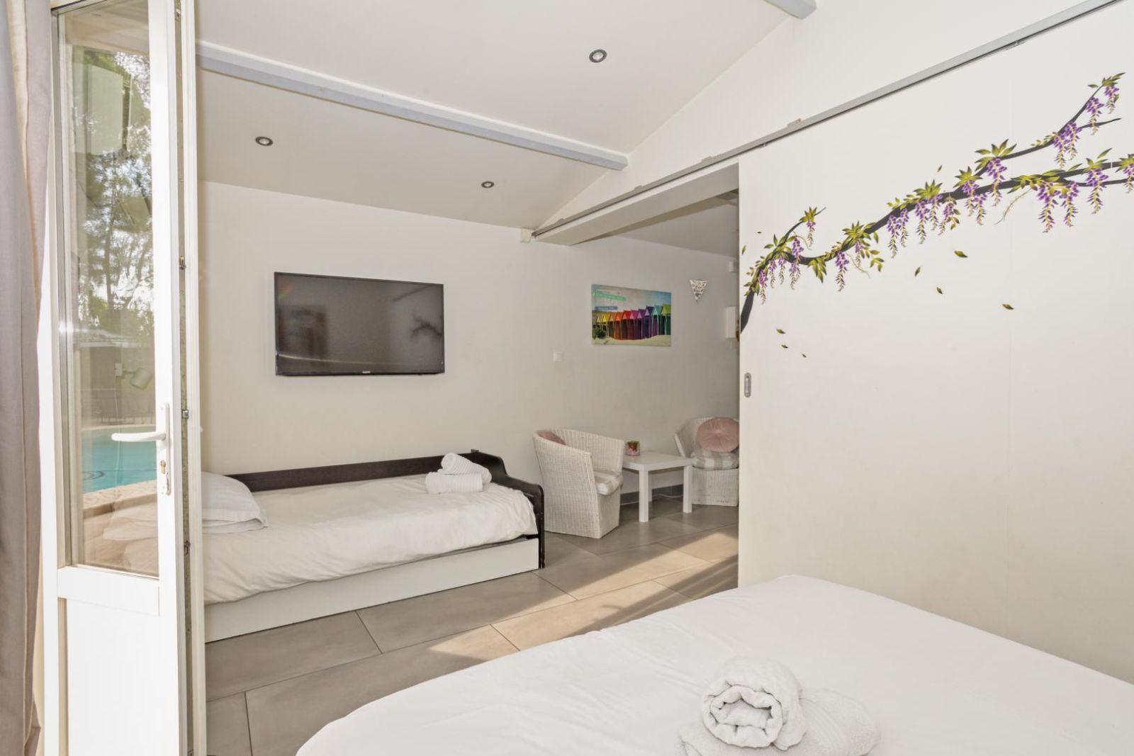Ménage, draps et linge de toilette sur demande (pack 70€). Équipement bébé sur demande (lit parapluie, chaise haute, baignoire, transat). Hors saison, séjour possible à partir de 2 nuitées . Lit supplémentaire sur demande (supplément). Piscine commune accessible (sauf le dimanche), sécurisée, grand jardin méditerranéen avec espaces fleuris et ombragés.