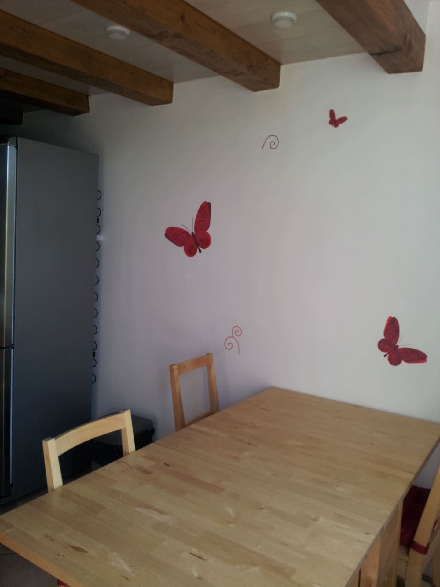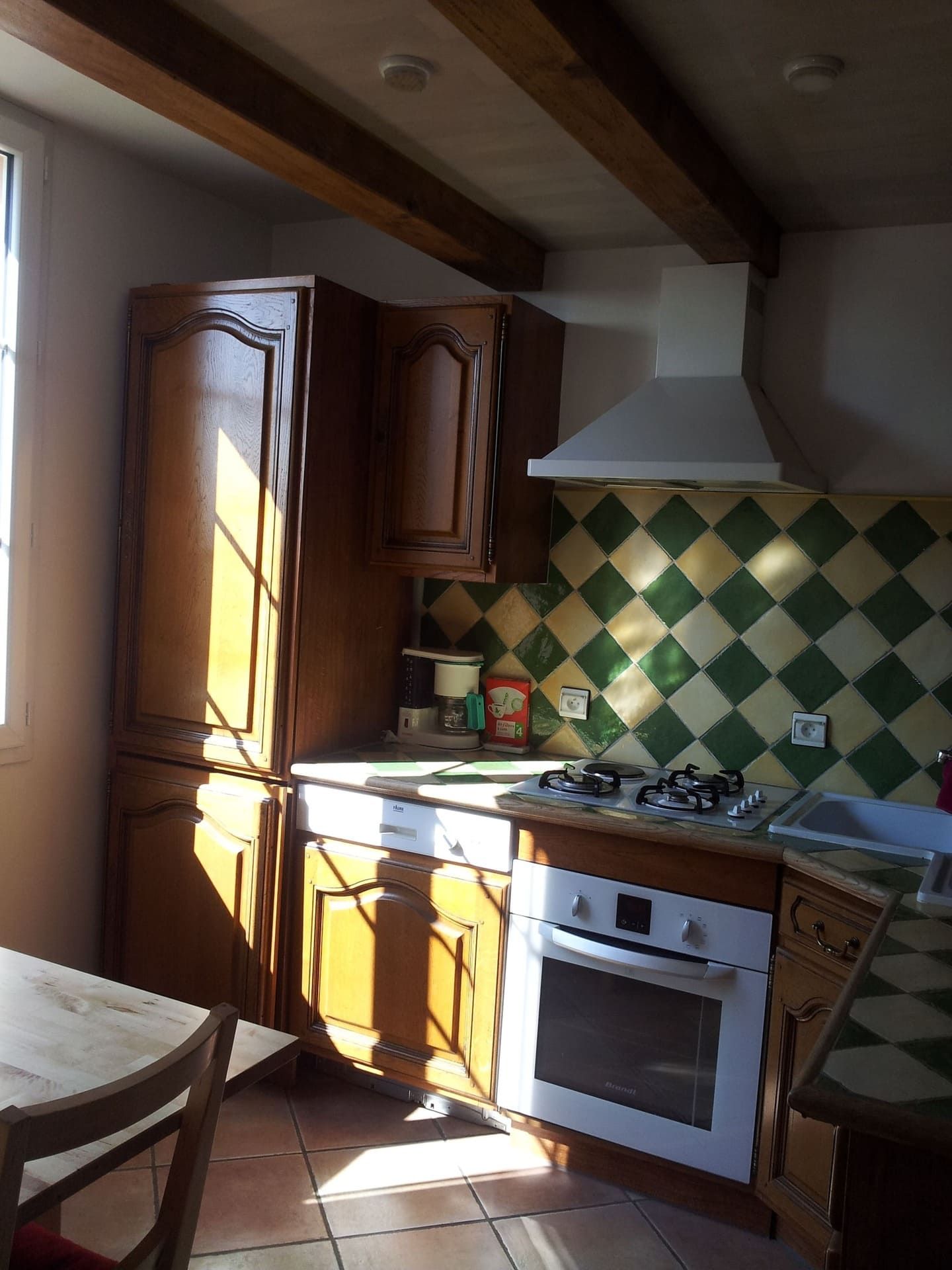 - Au 1 er étage, il y a une cuisine équipée : d'un lave-vaisselle, four à pyrolyse, micro-ondes , bouilloire électrique, cafetière électrique classique, plaque vitrocéramique, grand réfrigérateur-congélateur et dans le prolongement de la cuisine se trouve le salon-séjour avec un canapé-lit (140/190) et un téléviseur écran plat et connexion internet en wifi.