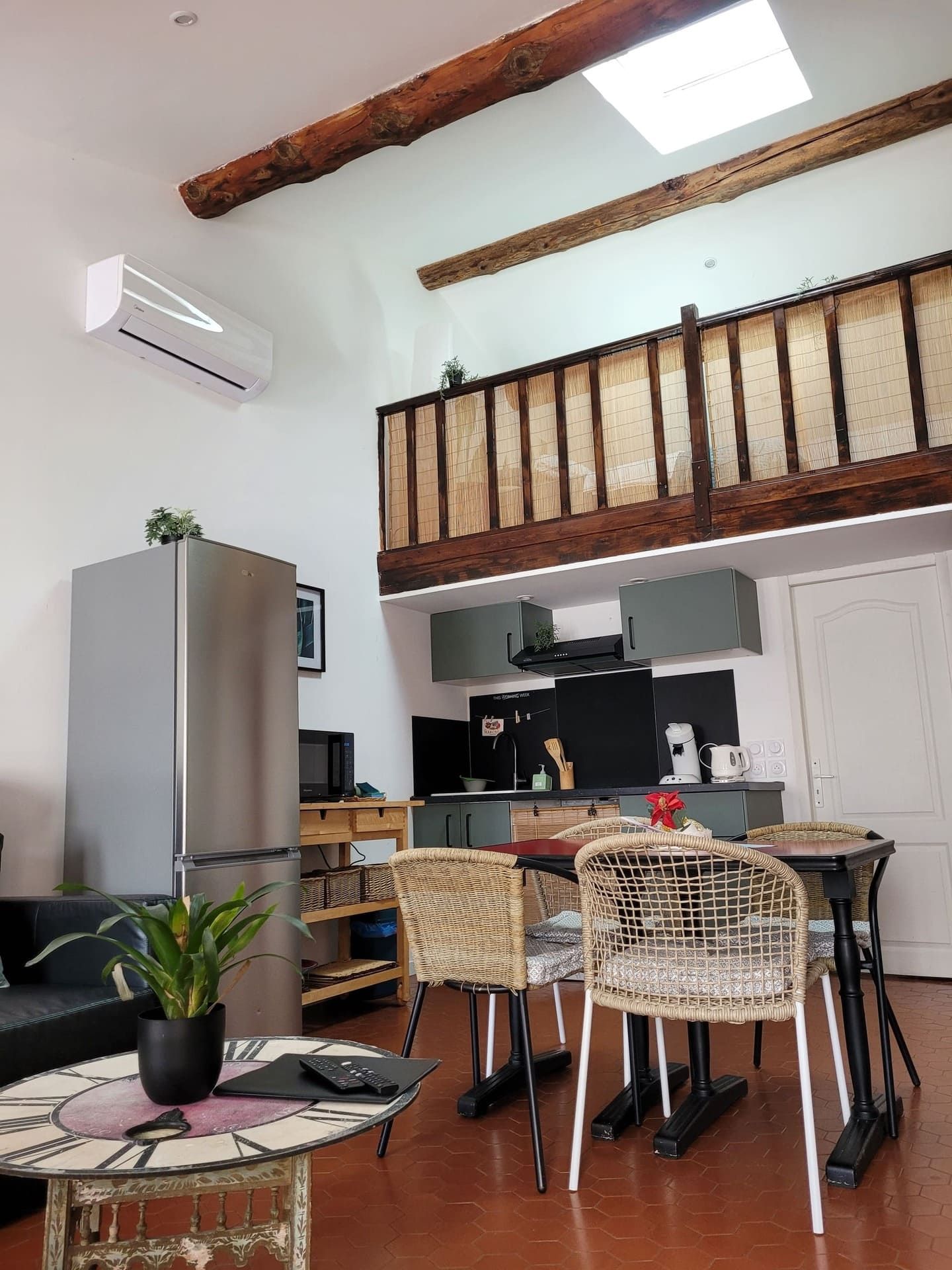 Nombreuses touches déco chinées et design exclusif, climatisation, chambre en mezzanine avec lit queen-size, espace Bureau pour télétravail. WIFI, salon avec accès terrasse, canapé convertible et Smart-TV , cuisine neuve bien équipée, salle de bain avec lave-linge, WC indépendant.