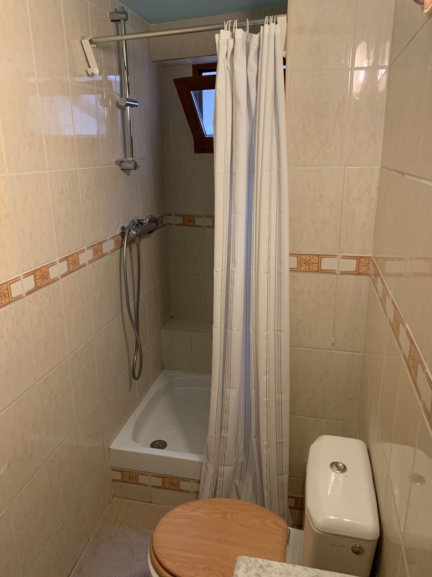La salle de bain est en enfilade. Elle est équipée d’une vasque, d’une douche avec banc maçonné, d’un wc et d’un sèche serviette.