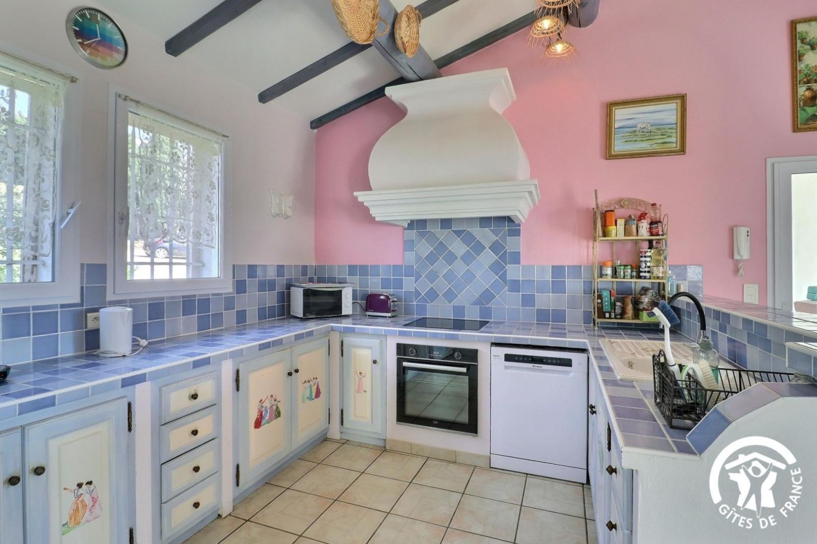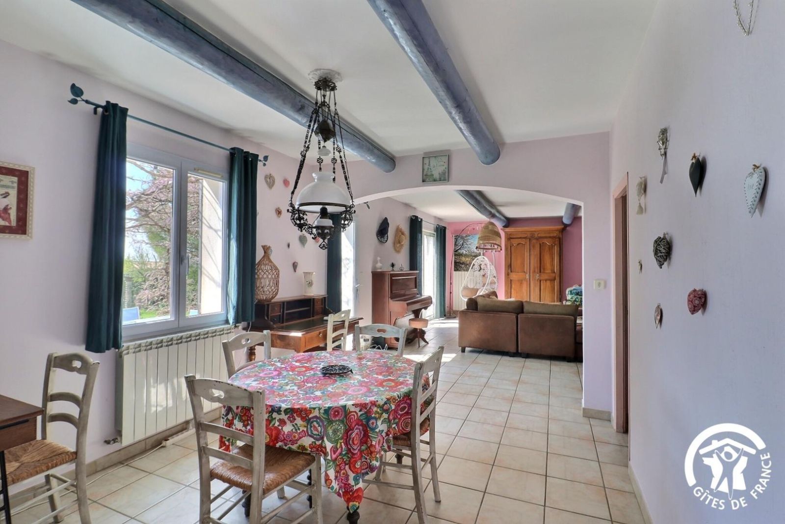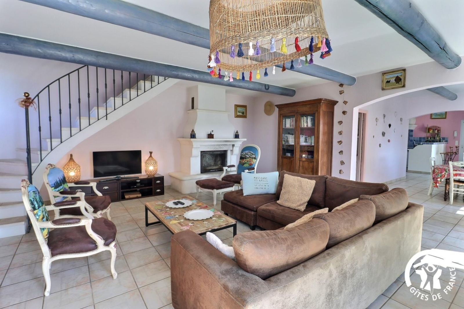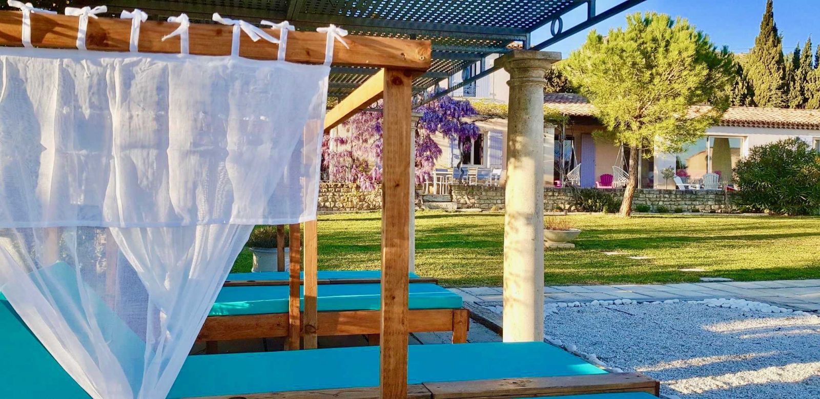 Parmi les 3 gîtes de la propriété, le Mazet de Maïs est reconnaissable entre tous ! Une magnifique pergola protège la façade sud. Sous les fleurs de la glycine au printemps ou à l'ombre de sa frondaison en été, les heures égrennent le temps délicieusement alors que les pensées vagabondent entre les cyprès, les oliviers et les lavandes qui bordent la piscine. Les prés des chevaux, les roches et les garrigues des Alpilles, la maison et le jardin, tout trace les contours, sème les parfums et colore l'âme d'un paysage profondément provençal.