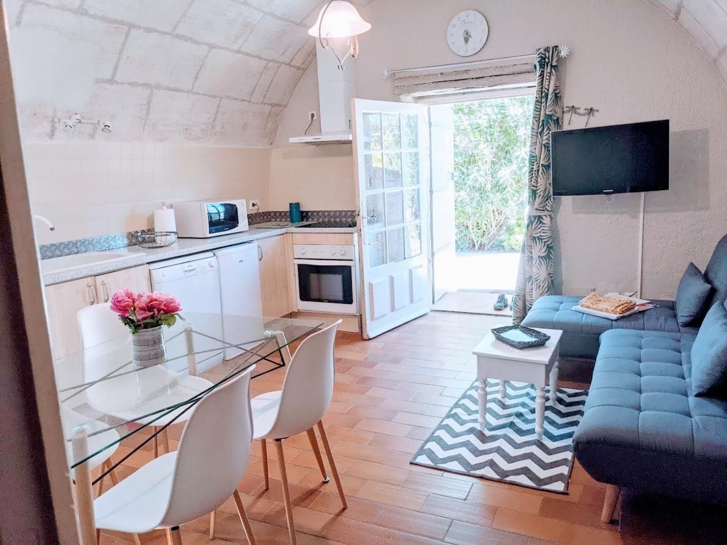 Vous entrez par la cour/jardin (30 m² avec salon de jardin) dans la pièce de vie : canapé en angle, espace repas, cuisine intégrée (lave vaisselle, plaques vitrocéramiques 4 feux, four, micro ondes, 1 grand frigo/congélateur + 1 frigo table top, petit électroménager), télévision écran plat. Chambre pour 4 personnes avec lit 2 personnes (160x200cm) et coin nuit fermé par une verrière avec 2 lits superposés (90x190cm). Salle d'eau avec douche 80x80cm, vasque, WC et porte-serviettes chauffant.