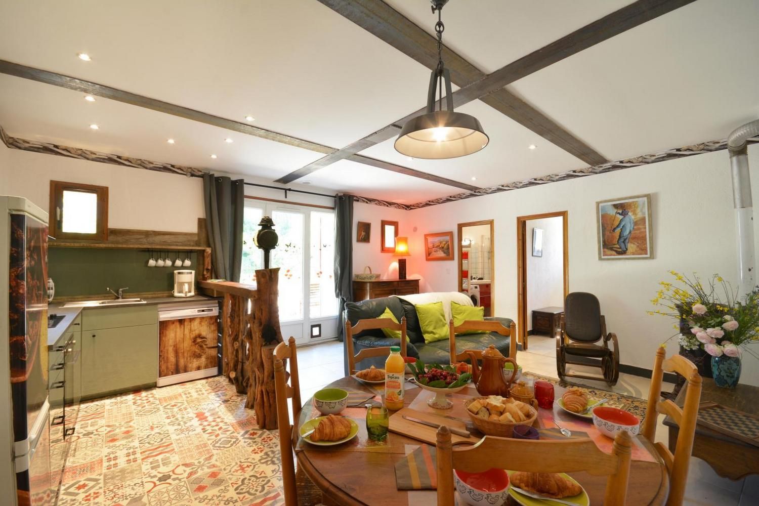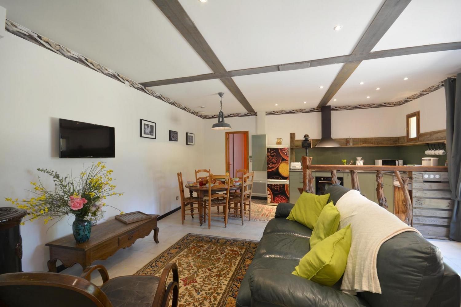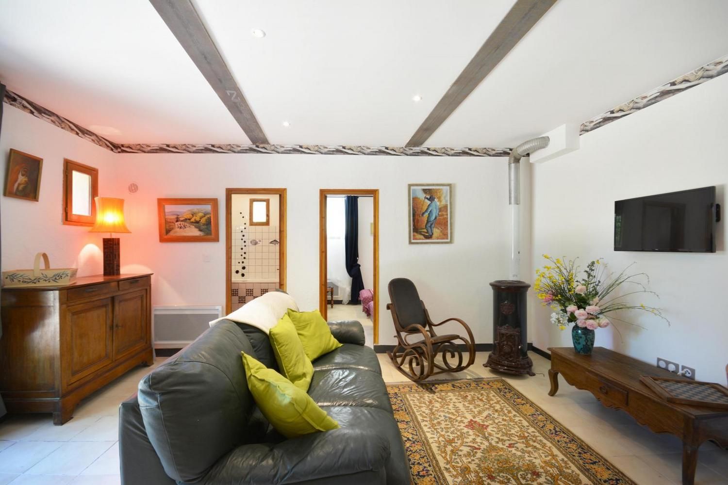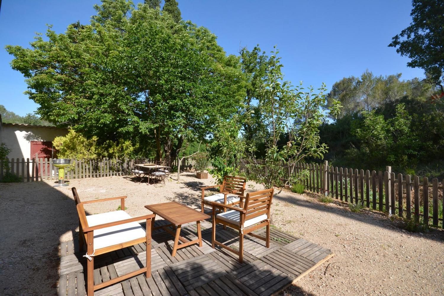 En campagne, le gîte la Bergerie est situé dans un mas du XVIème siècle, sur la façade nord du bâtiment, avec cour privative fermée. Ce gîte a été aménagé avec beaucoup de coeur, avec la volonté d'accueillir au mieux les personnes handicapées et leur entourage. Ce gîte est labellisé Tourisme et Handicap pour les handicaps auditif, mental et visuel. Sur place, deux autres gîtes et l'habitation des propriétaires. Accès via un escalier privatif extérieur à partir du parking. Grande cour ombragée de 130 m² avec salon de jardin et salon détente sur terrasse en bois, barbecue. Entièrement en rez de chaussée : belle pièce de vie lumineuse, avec cuisine équipée ouverte (plaque vitrocéramique, four, micro-ondes, lave-vaisselle), coin salon avec TV écran plat, espace repas. Poêle à bois (1ère flambée gratuite). 1 chambre avec 1 lit 2 personnes (140x190cm) et 1 lit une personne (90x190), dans des couleurs gaies et lumineuses. Une chambre avec 2 lits 1 personne (90x190 cm). Salle d'eau avec douche à l'italienne, meuble vasques double et porte-serviettes chauffant, WC, lave linge. Piscine commune 9 x 4,5 m, profondeur de 1.20 à 1,65 m, accessible de 10h à 20h, ouverte de juin à septembre. Grand espace extérieur commun avec les autres gîtes, table de ping-pong, terrain de pétanque à disposition. Ménage de fin de séjour en option (60 €), draps, linge de toilette et de table en location, Wi-Fi, chauffage électrique en hiver (relevé de compteur). 1 seul chien admis sous conditions : en laisse hors du terrain clos et accès interdit à la piscine Venelles est à 2.5 km et accessible à pied par un chemin rural, vous y trouverez tous les commerces. Une très bel endroit, paisible, entouré de bois, des chevaux dans les prés, la mare et ses grenouilles, les champs de foin et de luzerne, les chemins de randonnée au départ du mas : vous y serez bien !