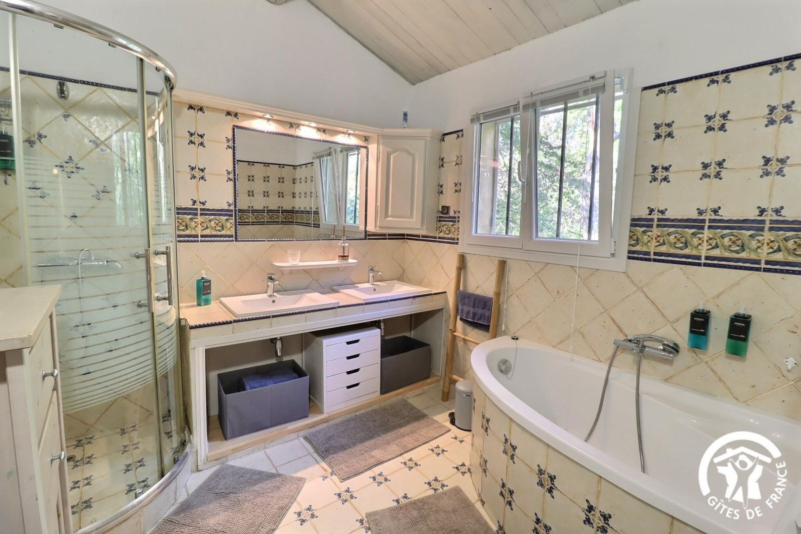 - Une salle de bain avec baignoire, douche et double vasque
