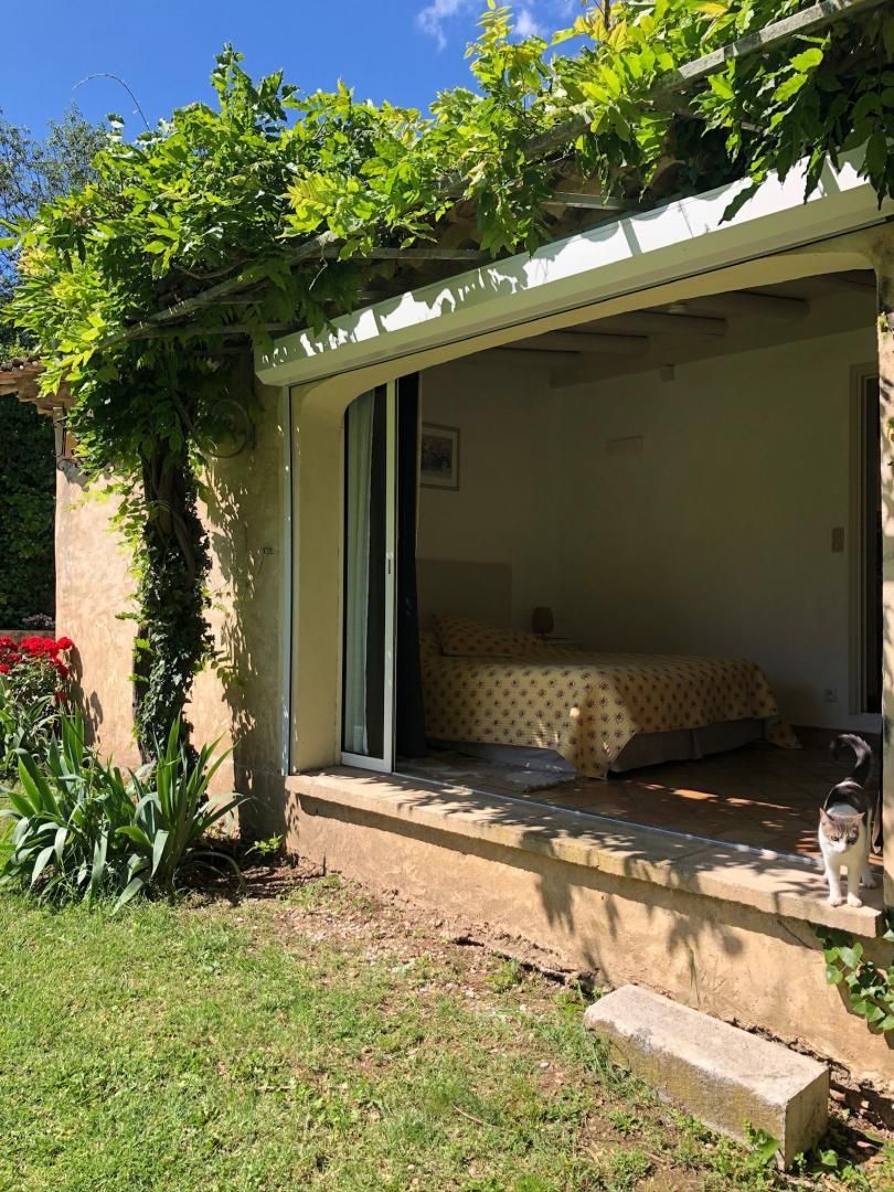 - Une chambre avec armoire et lit 160x200 avec une grande baie vitrée offrant une superbe vue sur le jardin et la piscine